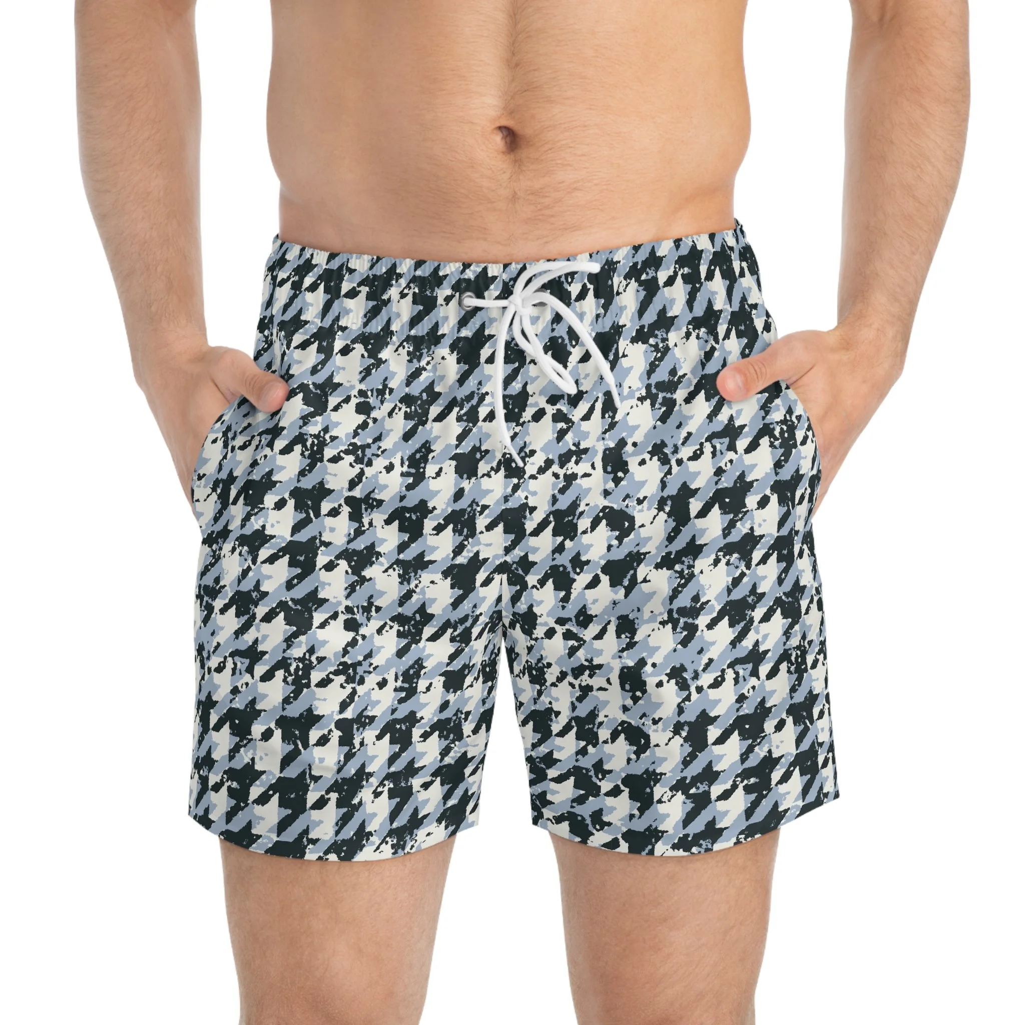 These blue houndstooth swim trunks bring a quiet confidence to days by the water. The small-scale geometric pattern feels both classic and modern—like a well-worn seafront blazer translated into lightweight swimwear. Wear them to the beach, drop them over trunks after a surf, or pack them for a weekend at a lakeside cabin. The quick-dry, extra-light fabric moves with you: it breathes on hot afternoons and sheds water when you walk back to the boardwalk. A drawstring waist and mesh-lined pockets keep your essentials secure while you wade or paddle. They settle into your routine without fuss, offering clean lines and a tailored-looking fit that suits anyone who prefers a refined, low-key aesthetic at the shore or pool.