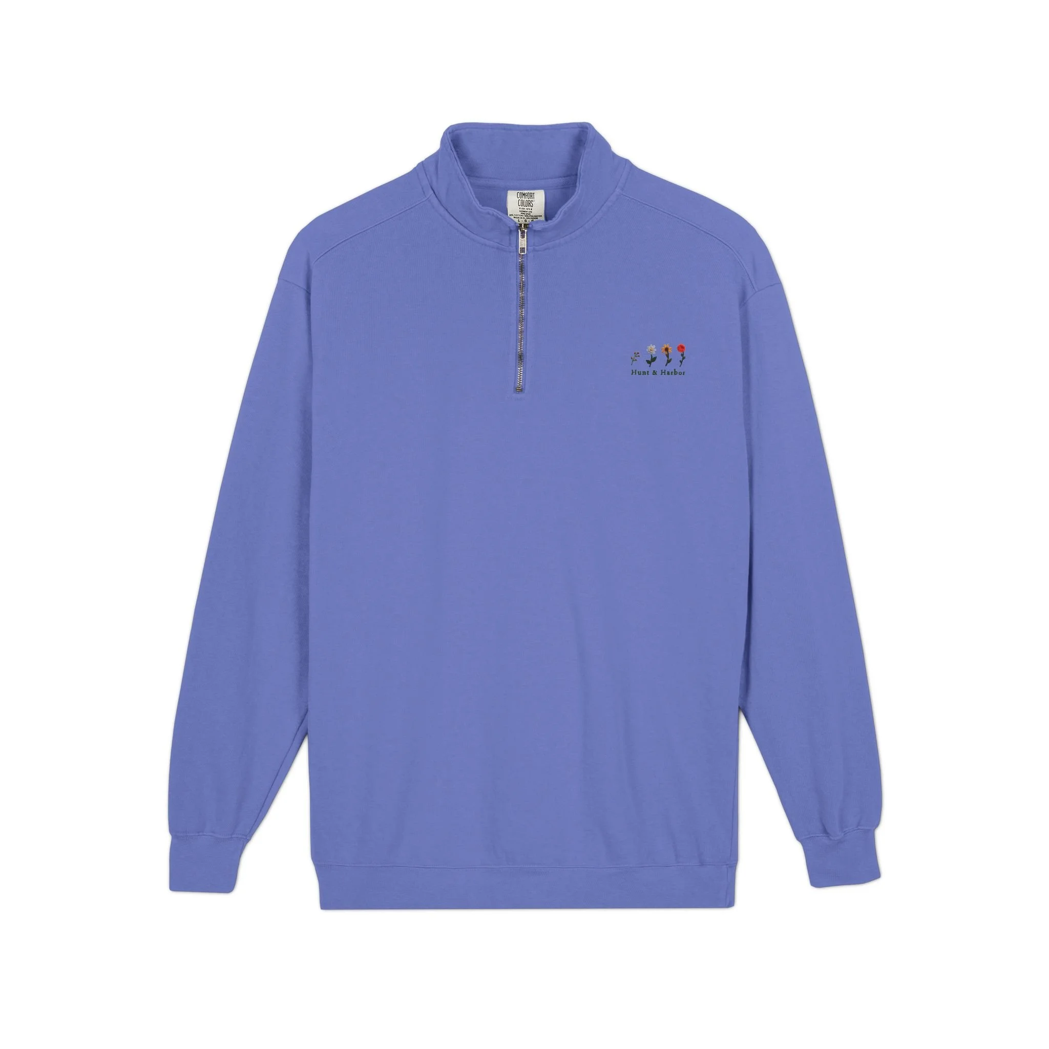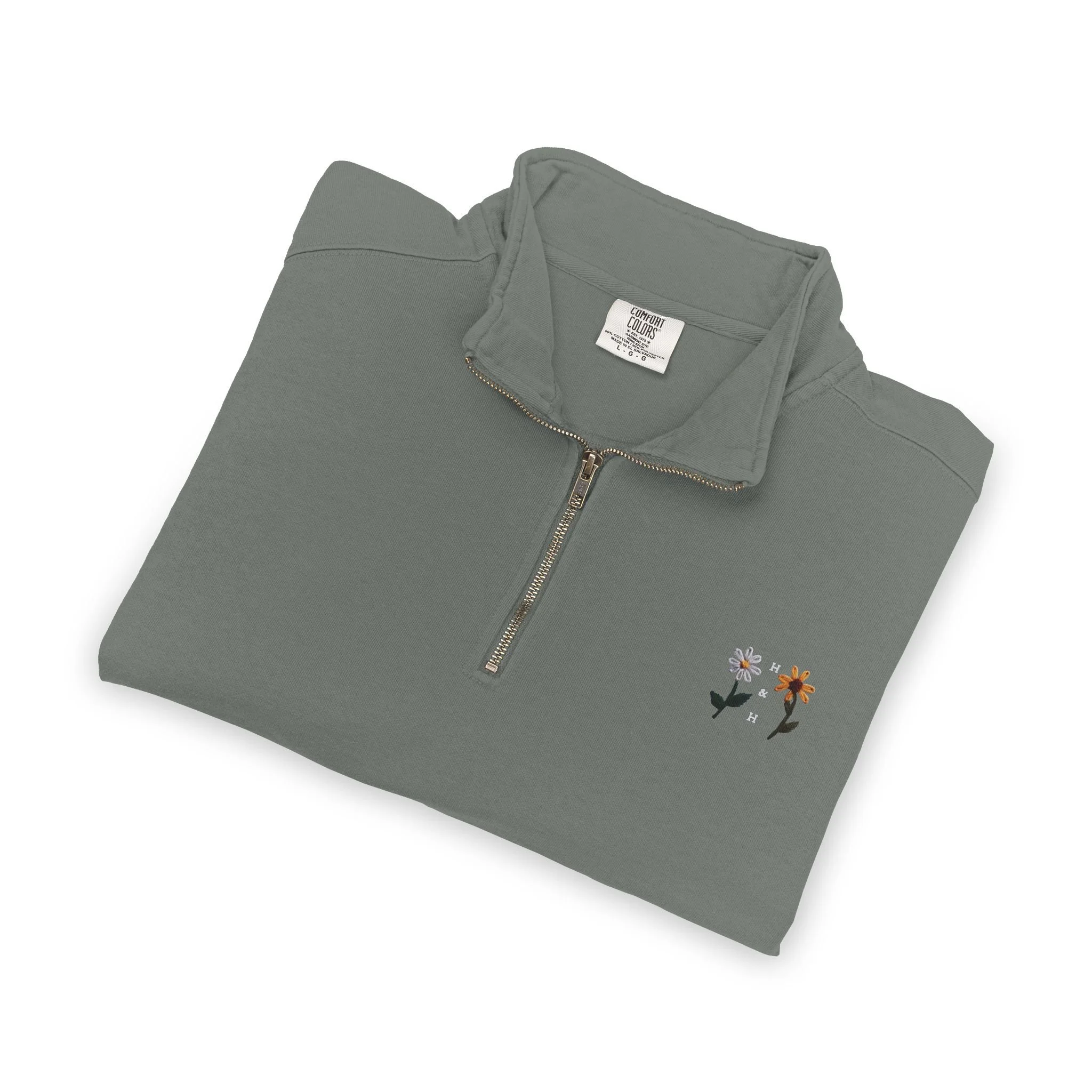This embroidered quarter-zip brings a quiet, cultivated energy to casual wardrobes. Hand-stitched floral logos sit just above the chest, their delicate petals and stems catching the light against a substantial, soft fabric. Slip it on for slow mornings with coffee or for afternoons spent in a sunlit studio; the relaxed silhouette and self-fabric lined collar feel familiar right away, while the embroidered motifs make each piece personal and subtly expressive. The rolled-forward shoulders and ribbed cuffs keep movement easy, so it layers naturally over tees or under a weathered coat. Colors use low-impact OEKO-TEX dyes, giving the sweatshirt a gentle, lived-in look without harsh chemical finishes. For people who favor thoughtful details over loud branding, this quarter-zip reads like a quiet signature — floral, handcrafted, dependable.