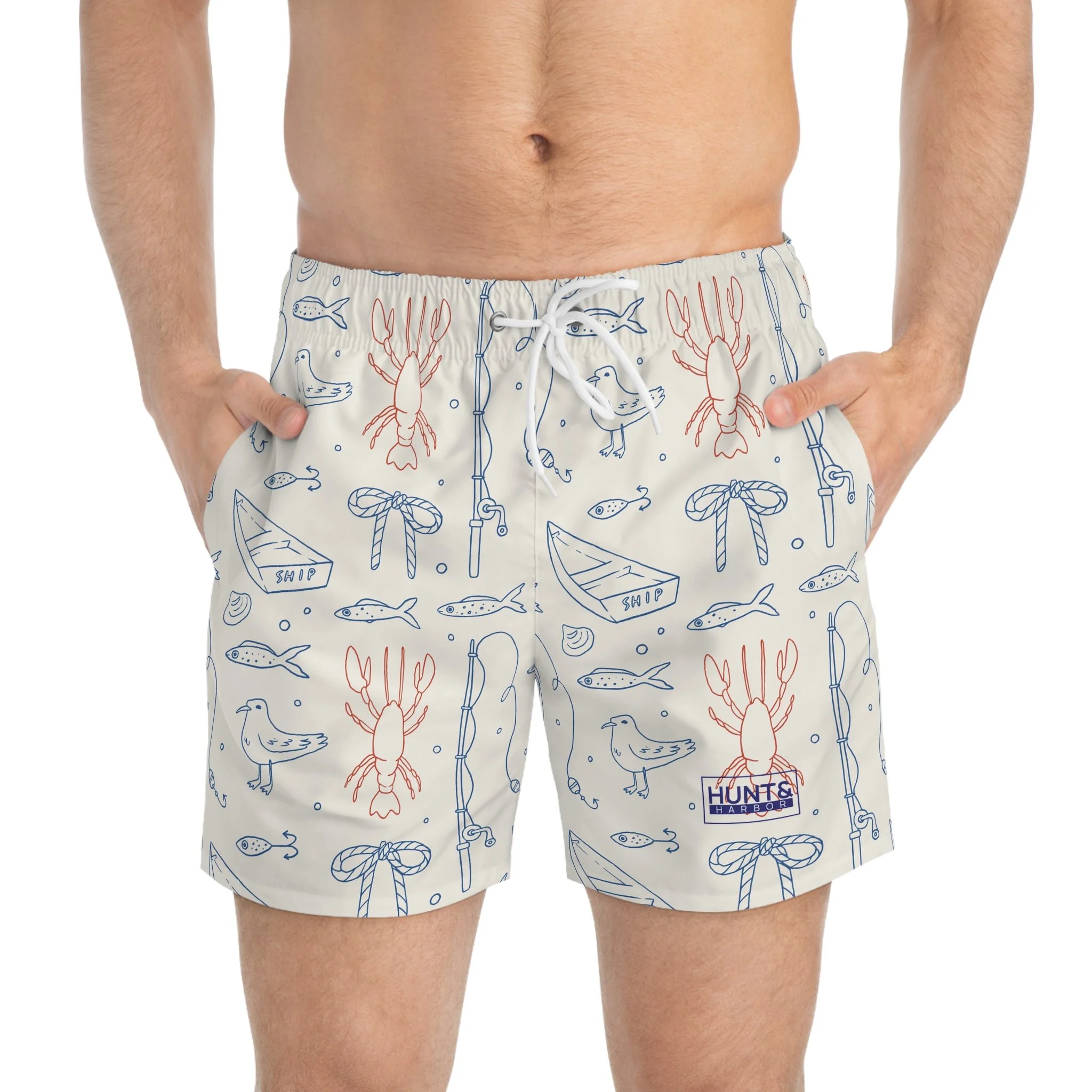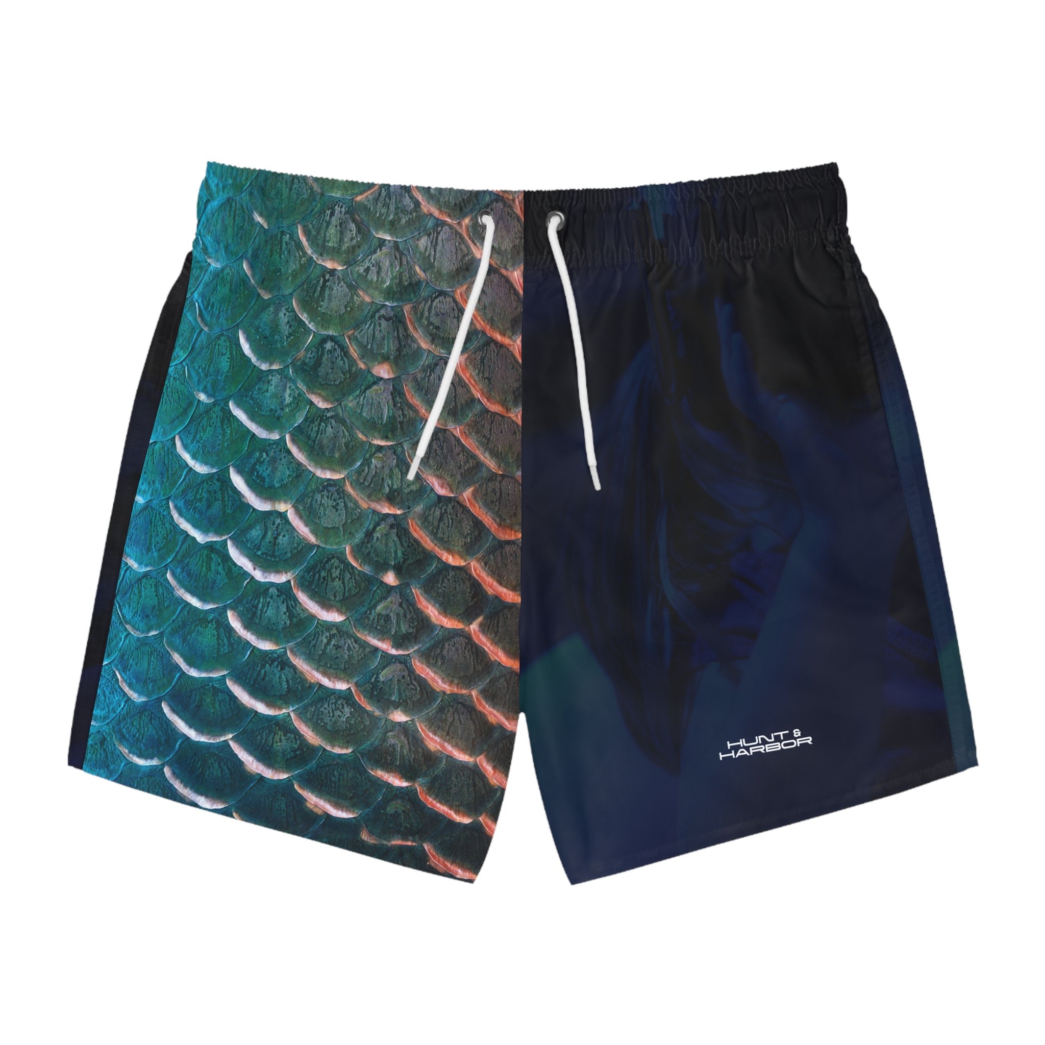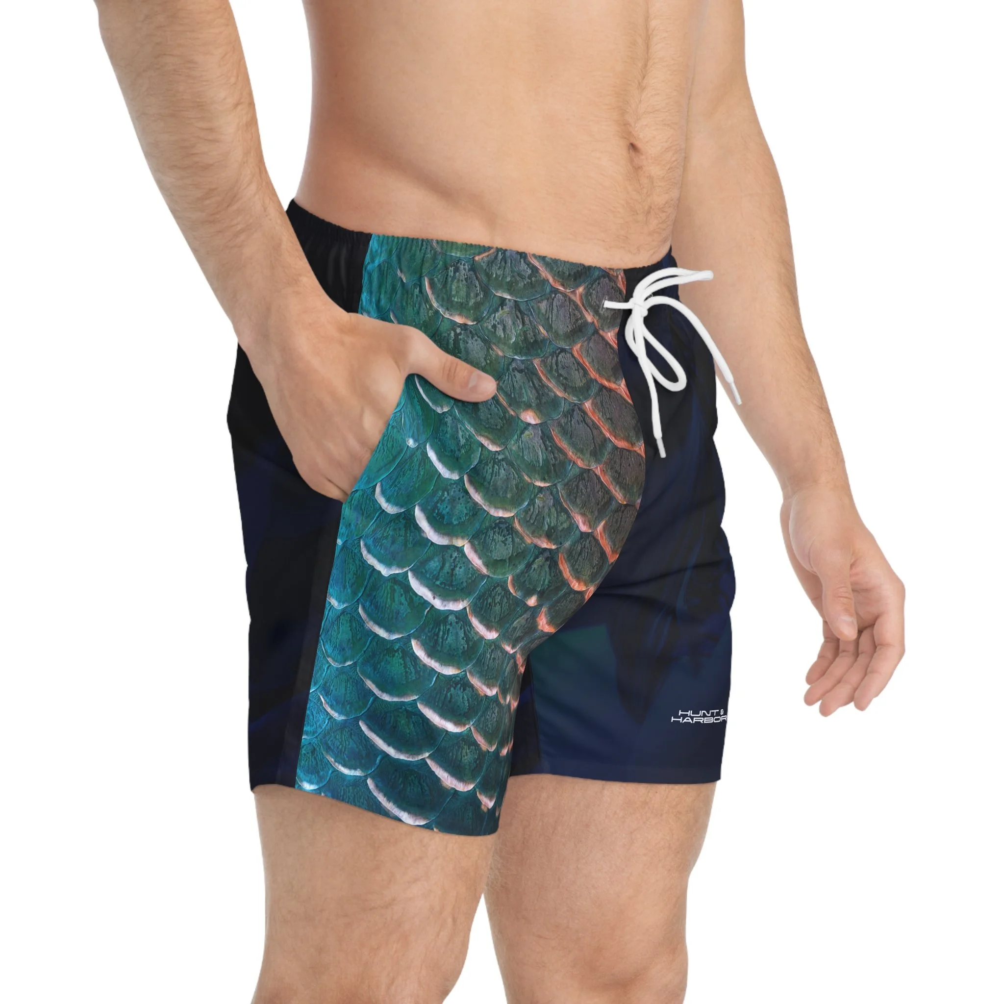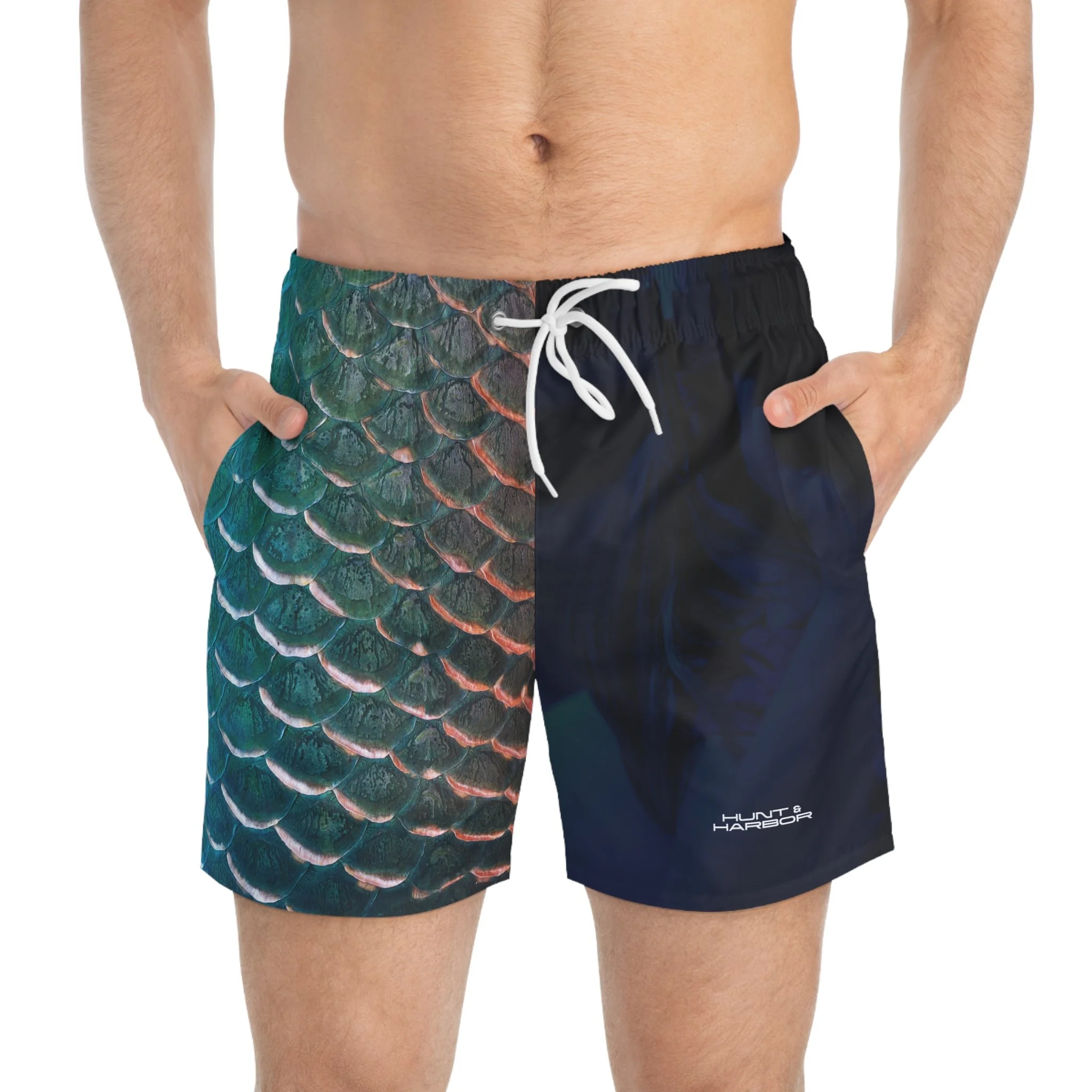 These swim trunks mix outdoors grit with ocean calm. The overall dark-blue, ocean-like print wraps the body like deep water, while the right-front panel pops with a hyper-real fish scale pattern—textured, glossy, and detailed enough that you’ll do a double-take. Lightweight and quick-drying, they move with you from kayaks and reef swims to evenings at the fire pit. Mesh-lined pockets and a mesh basket lining keep gear ventilated and secure. The low-rise cut with clean side seams gives structure without bulk, and the drawstring waist lets you fine-tune the fit whether you’re diving, paddling, or swapping stories as the sun sets. The print holds its vibrancy over many washes, so the scale detail stays sharp and the dark-blue depths stay rich. For people who live where land and water meet, these trunks feel both familiar and refreshingly bold.
