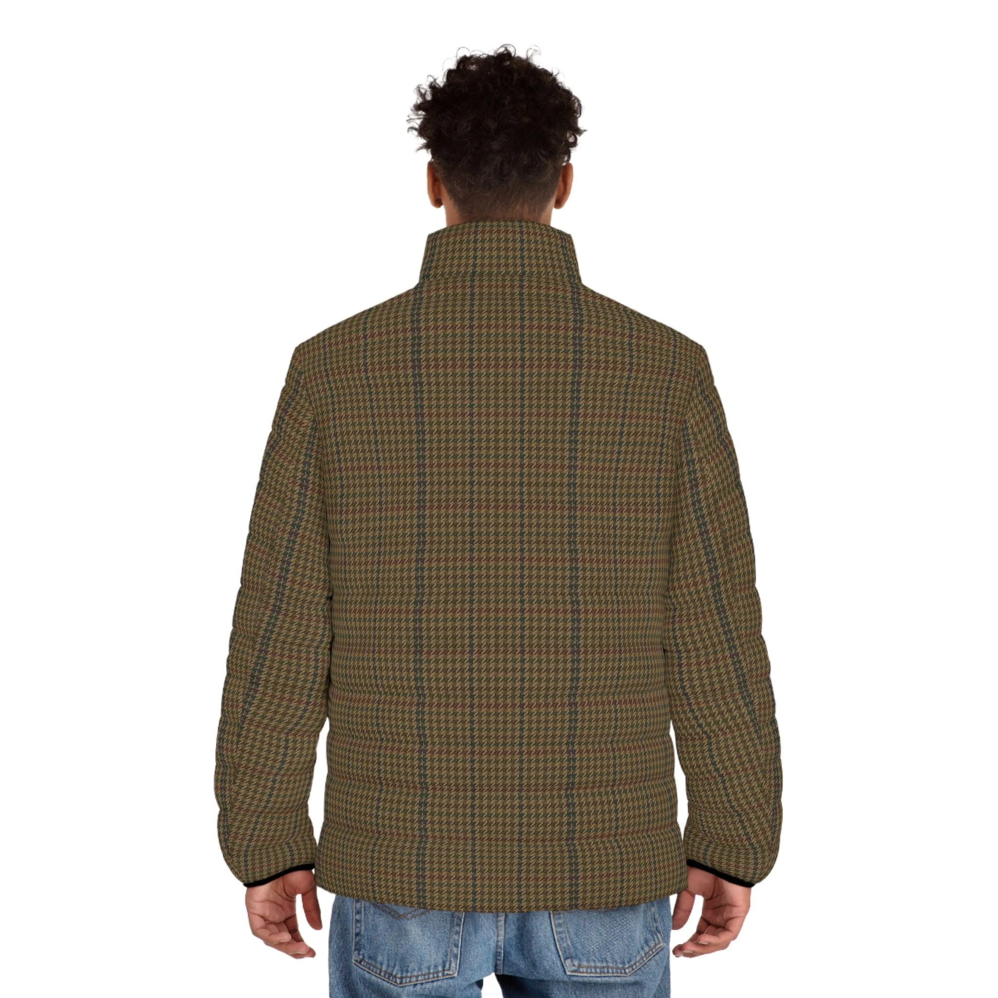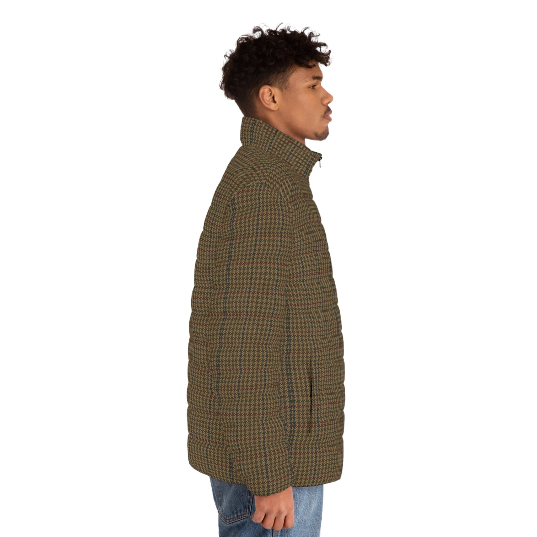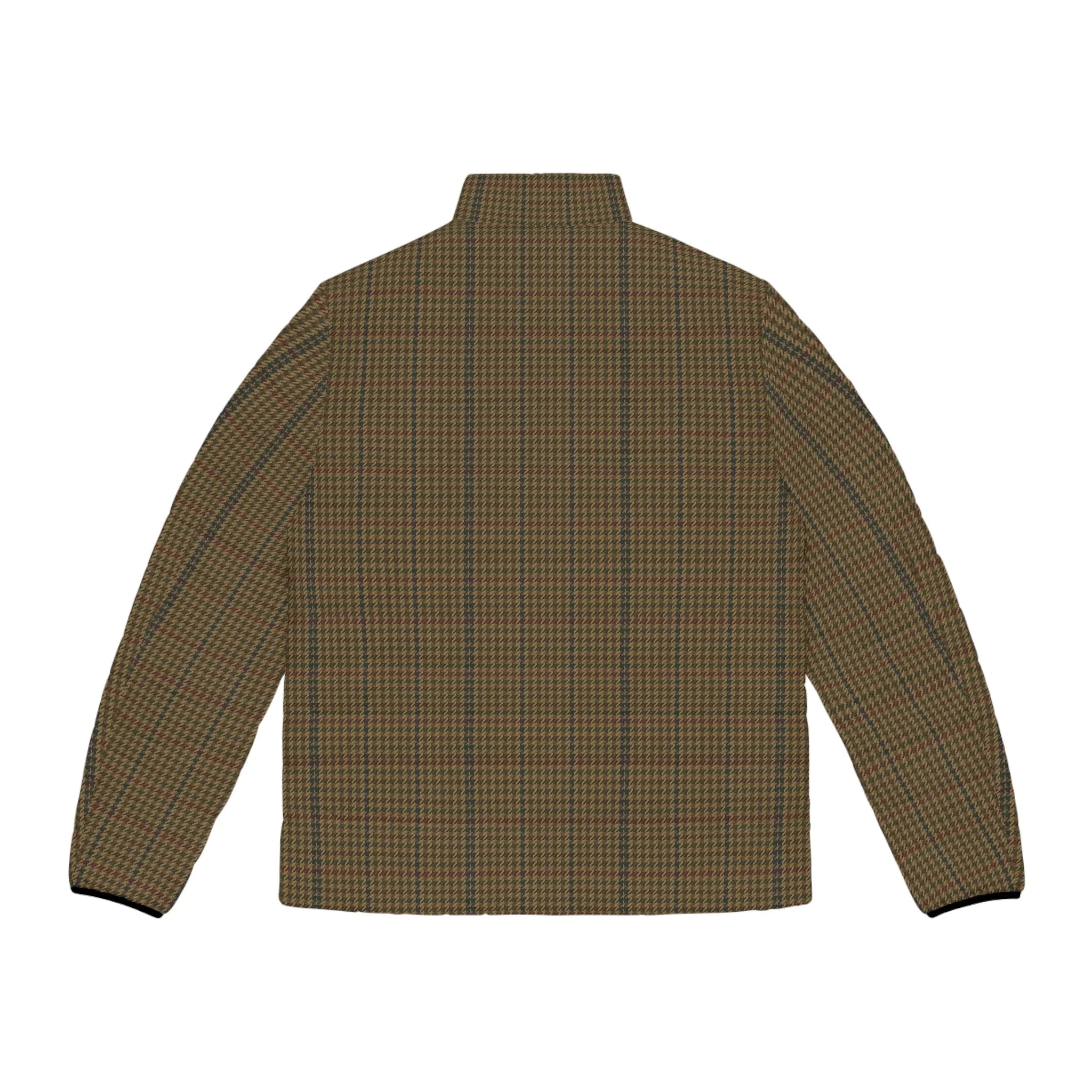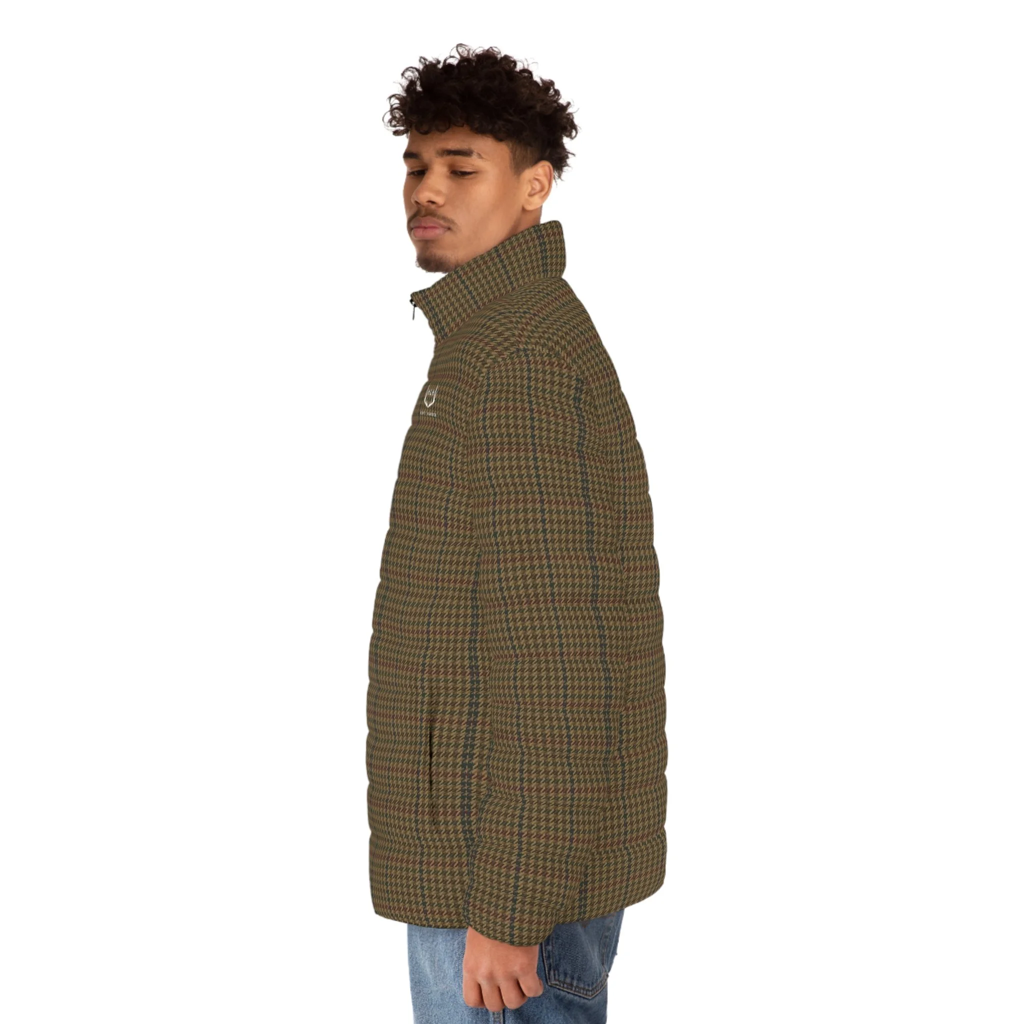 Slate-toned houndstooth puffer with a quiet alpine feel. Quilted in a lightweight shell that sheds moisture and keeps shape, it carries layered mountain ridges and pine silhouettes across the fabric — the kind of jacket you reach for before sunrise, coffee in hand, when the world is hushed and the trail is powdered. The stand-up collar and elastic cuffs hold heat without adding bulk. Two roomy side pockets swallow gloves or a phone. A smooth metal-slider zipper closes cleanly and reliably. The soft, black cotton-like lining hugs the skin and manages moisture during active mornings, yet the jacket packs down small to slip into a daypack or layer under a shell. Wear it for dawn hikes, cabin weekends, or slow city mornings when you want an outdoorsy, understated edge that feels lived-in and steady.