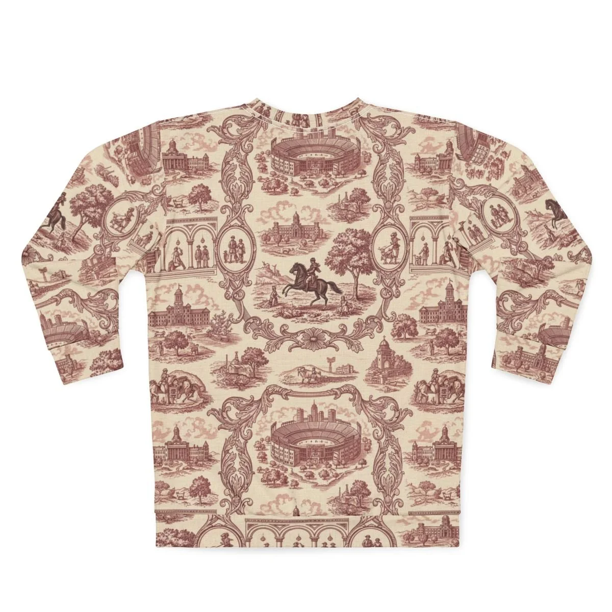 Elevate your wardrobe with this unique custom French toile pattern unisex sweatshirt featuring vignettes from Lubbock Texas, bursting with color and style. Perfect for cozy evenings at home or casual outings with friends, this sweatshirt offers versatility and comfort. Ideal for anyone who appreciates unique fashion, it's a fantastic gift for birthdays, holidays, or just to treat yourself. Celebrate this season's gatherings in style with this vibrant all-over print.