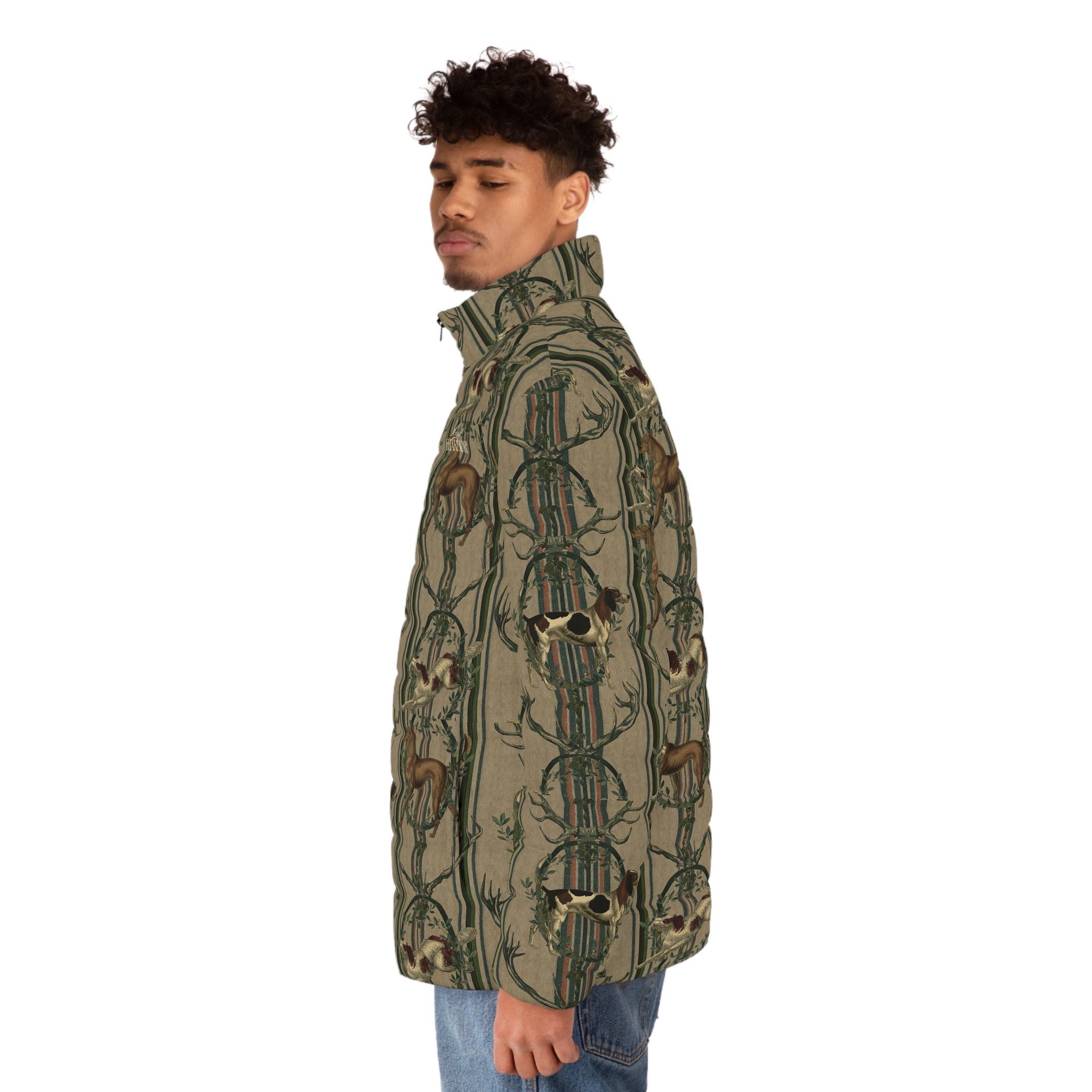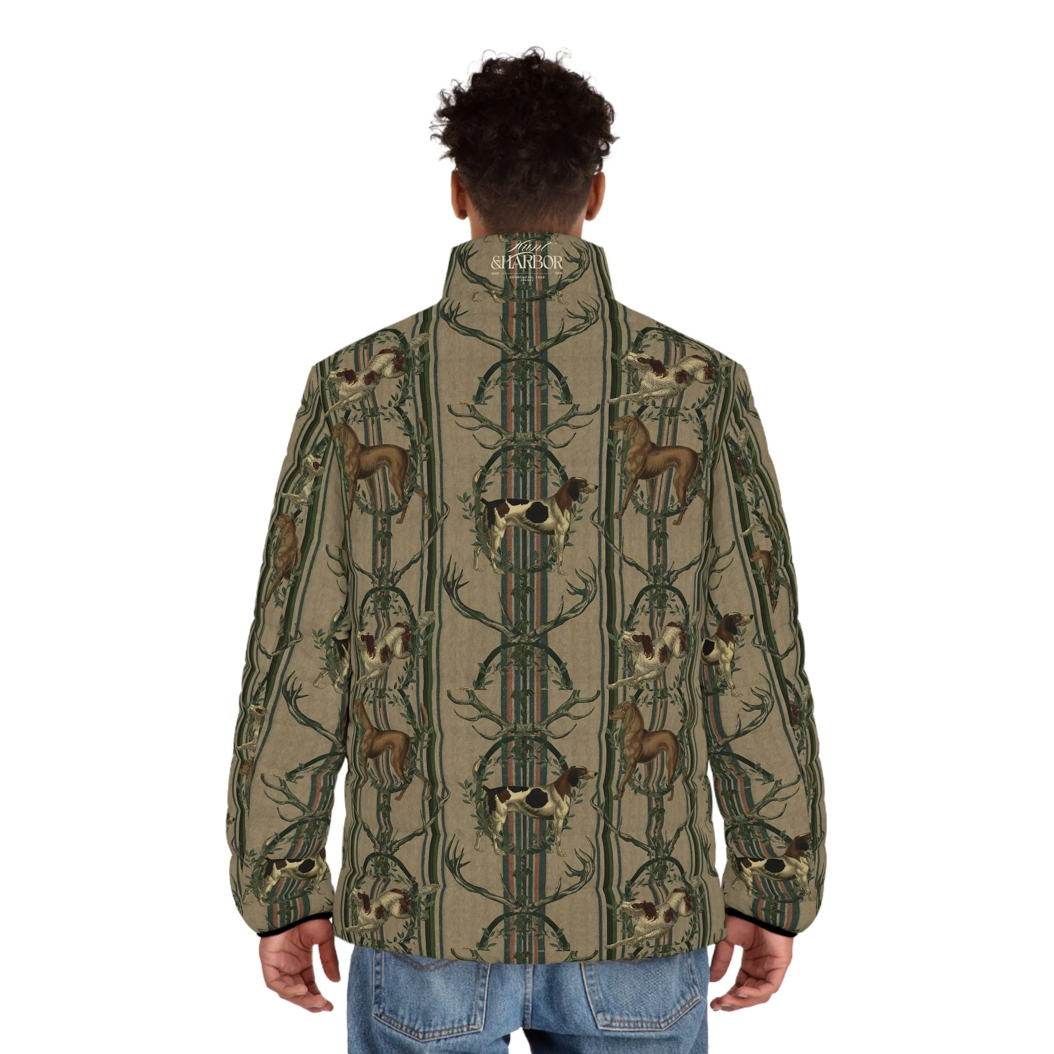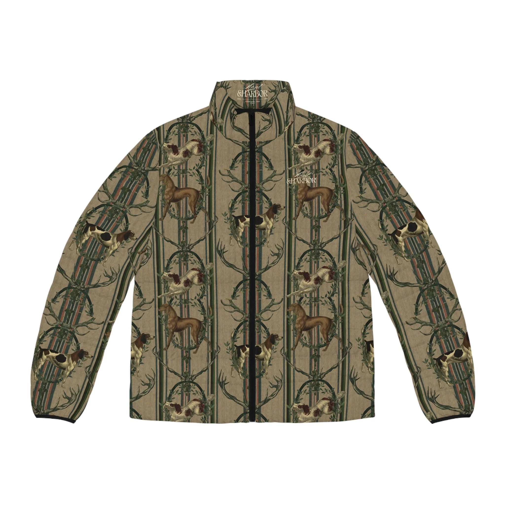 A cozy, outdoorsy puffer jacket that channels alpine hunting-dog heritage into everyday wear. Noble hounds leap across a striped backdrop, framed by leafy garlands and antlers for a quietly rugged, vintage-inspired look. The jacket’s matte shell and dark lining keep the visual grounded while the stand-up collar and elastic cuffs lock in warmth. Wear it on crisp morning treks, at the cabin after a day on the trails, or when you want a layered piece that reads both practical and storied. It feels familiar — like the first clear mountain air after a long winter — and pairs naturally with wool knits, worn denim, and boots used to mud and miles.