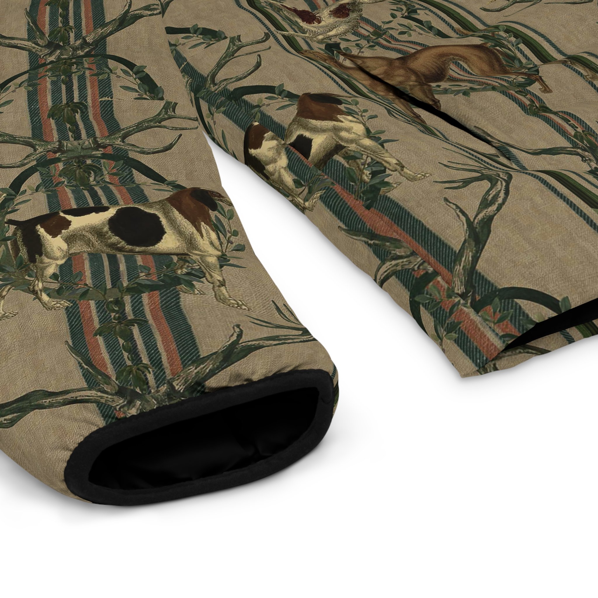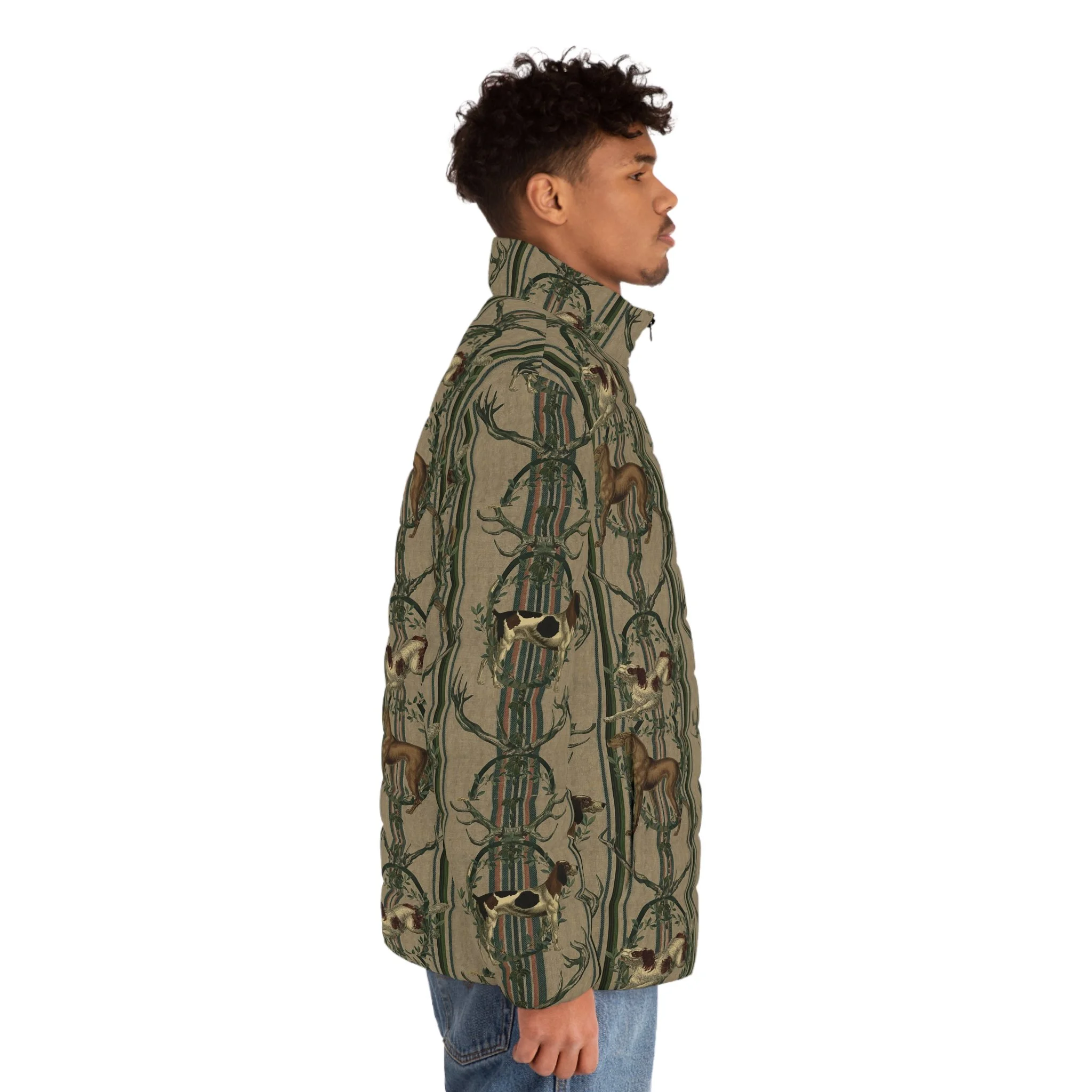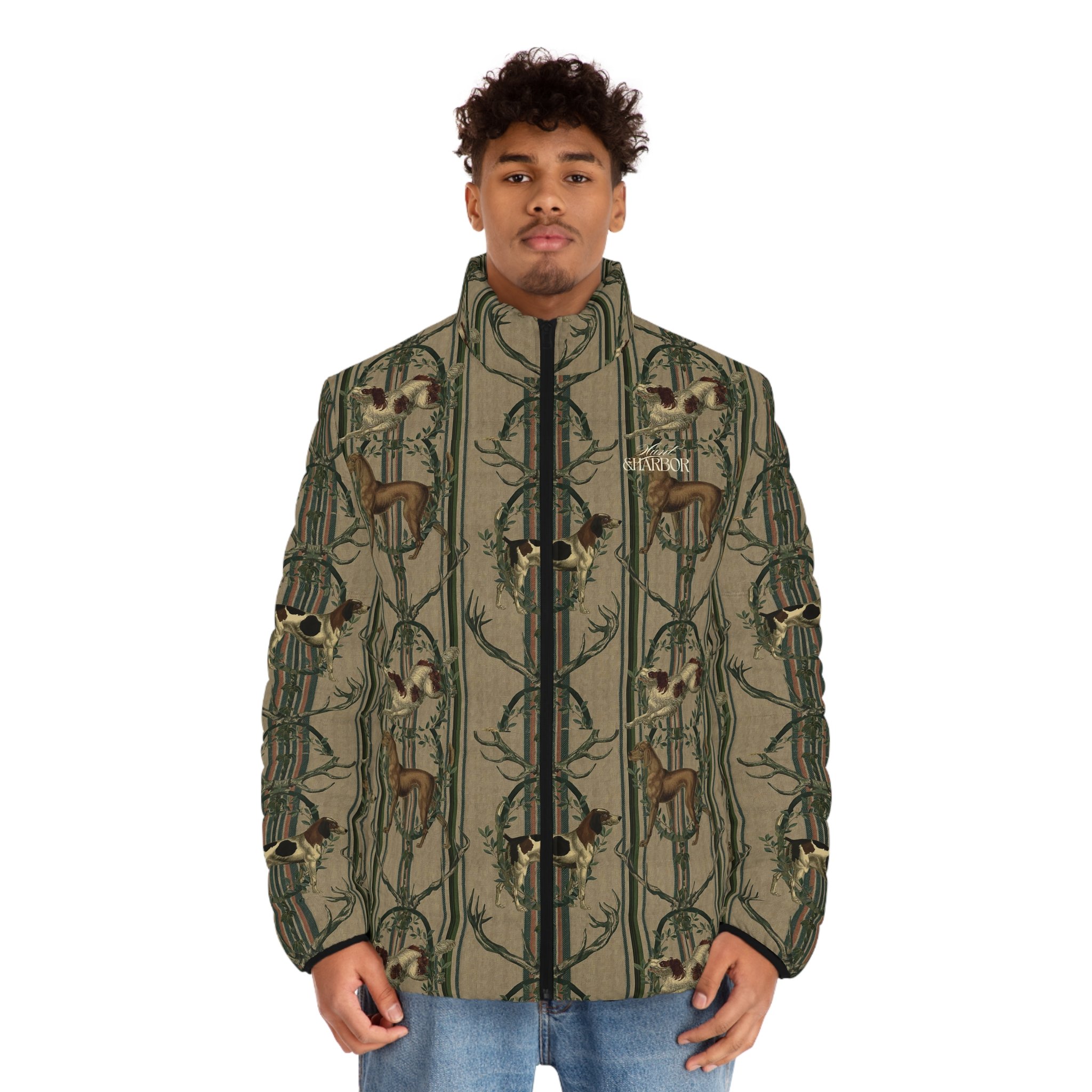 A cozy, outdoorsy puffer jacket that channels alpine hunting-dog heritage into everyday wear. Noble hounds leap across a striped backdrop, framed by leafy garlands and antlers for a quietly rugged, vintage-inspired look. The jacket’s matte shell and dark lining keep the visual grounded while the stand-up collar and elastic cuffs lock in warmth. Wear it on crisp morning treks, at the cabin after a day on the trails, or when you want a layered piece that reads both practical and storied. It feels familiar — like the first clear mountain air after a long winter — and pairs naturally with wool knits, worn denim, and boots used to mud and miles.