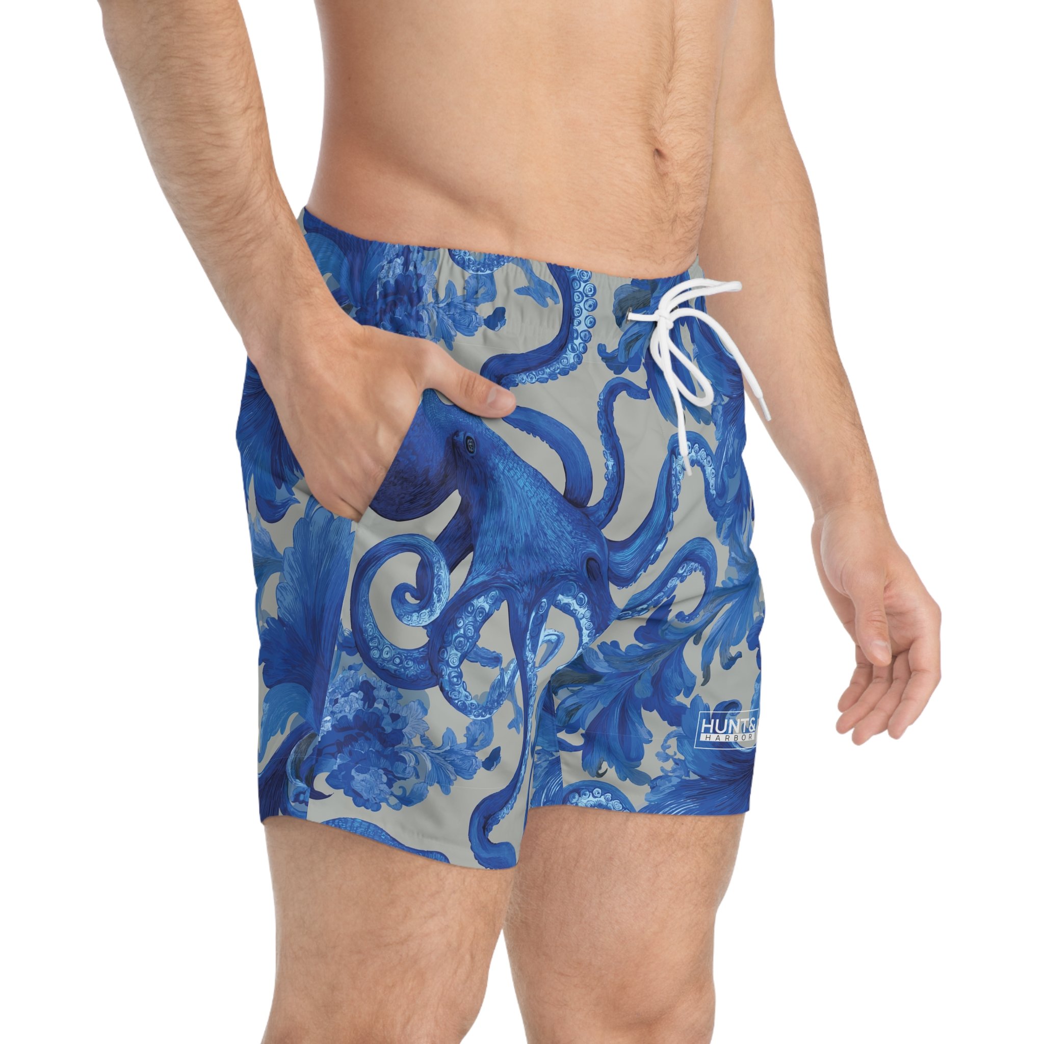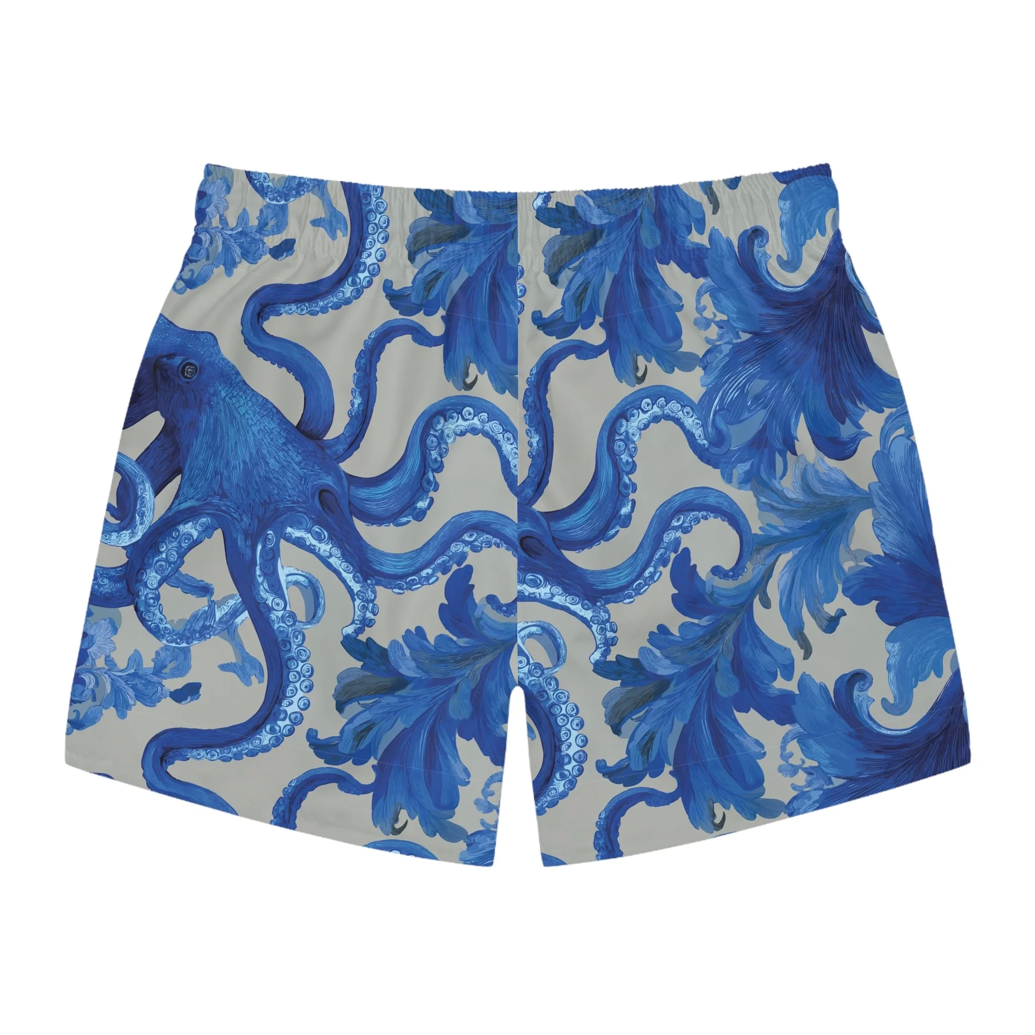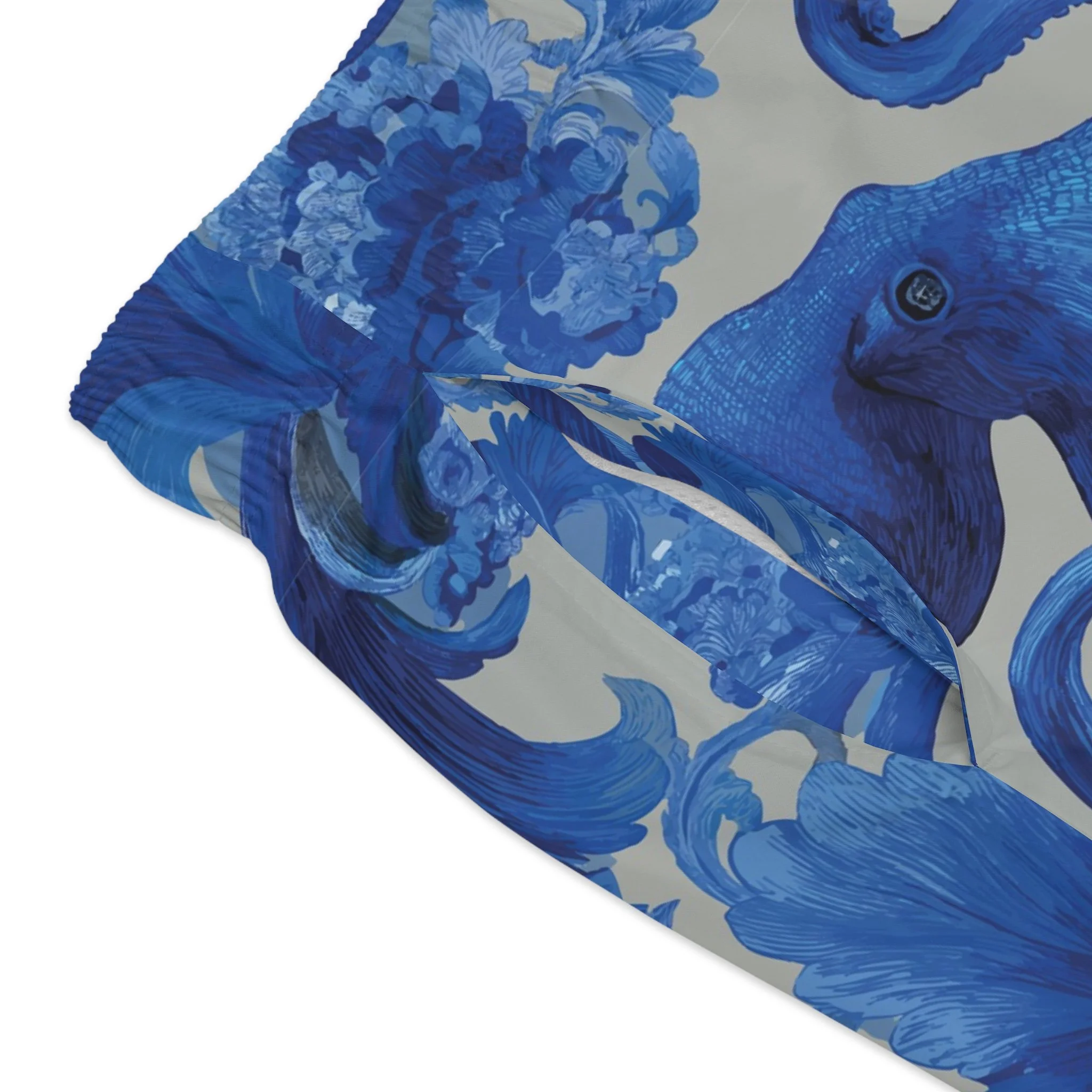 Salt on your skin, warm sun on your shoulders, and an old-world octopus drifting across a field of painterly blue blooms. These swim trunks bring that coastal reverie with you—lightweight fabric that moves like water, quick-drying performance for long beach days, and a hand-painted floral-and-cephalopod print that reads like a small story every time you sit down. The drawstring waist lets you dial in a snug, confident fit. Mesh-lined pockets and a supportive side seam structure keep gear and shape in place while you paddle, stroll the boardwalk, or linger at a seaside café. Wear them when you want swimwear that feels crafted and slightly adventurous—subtle art, seaworthy function, and effortless summer comfort.