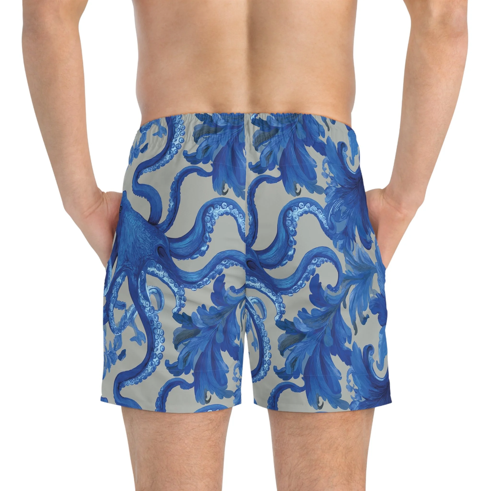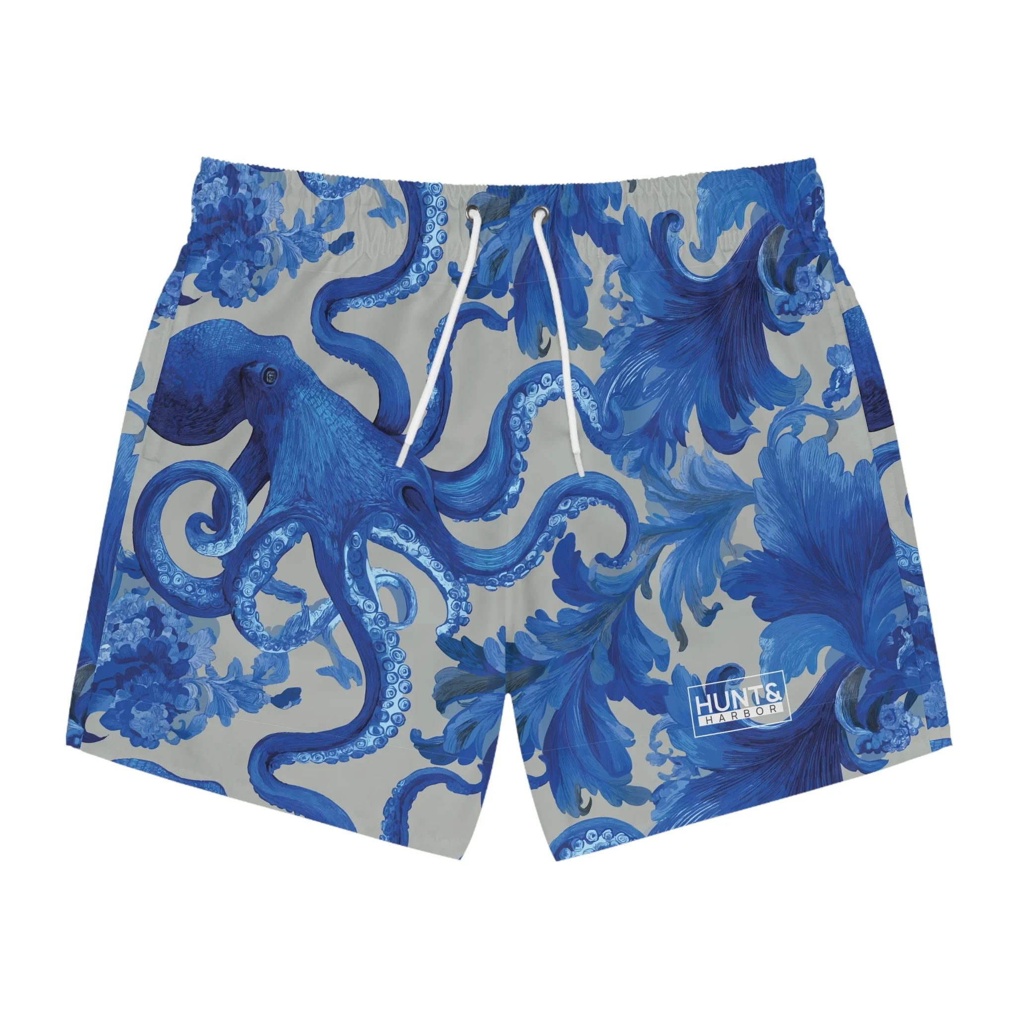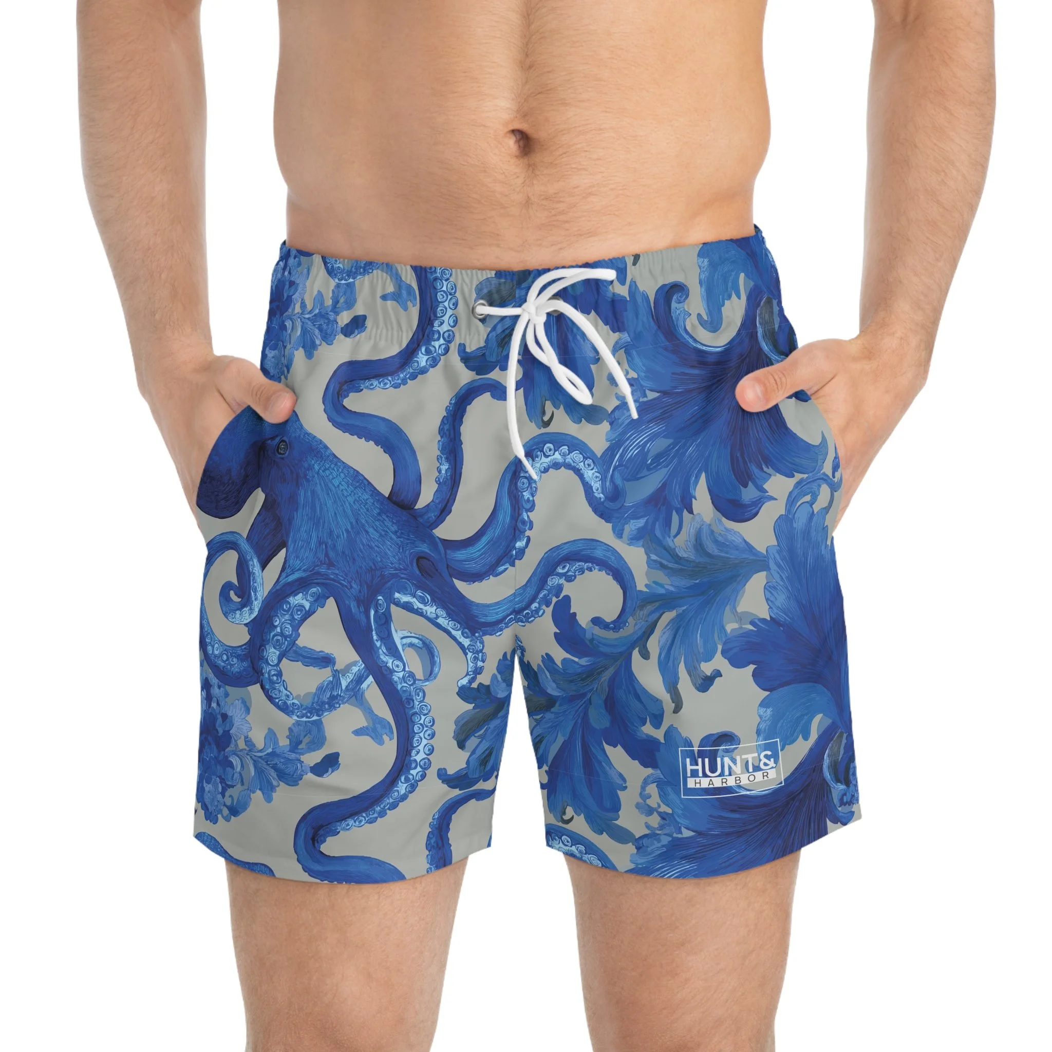 Salt on your skin, warm sun on your shoulders, and an old-world octopus drifting across a field of painterly blue blooms. These swim trunks bring that coastal reverie with you—lightweight fabric that moves like water, quick-drying performance for long beach days, and a hand-painted floral-and-cephalopod print that reads like a small story every time you sit down. The drawstring waist lets you dial in a snug, confident fit. Mesh-lined pockets and a supportive side seam structure keep gear and shape in place while you paddle, stroll the boardwalk, or linger at a seaside café. Wear them when you want swimwear that feels crafted and slightly adventurous—subtle art, seaworthy function, and effortless summer comfort.