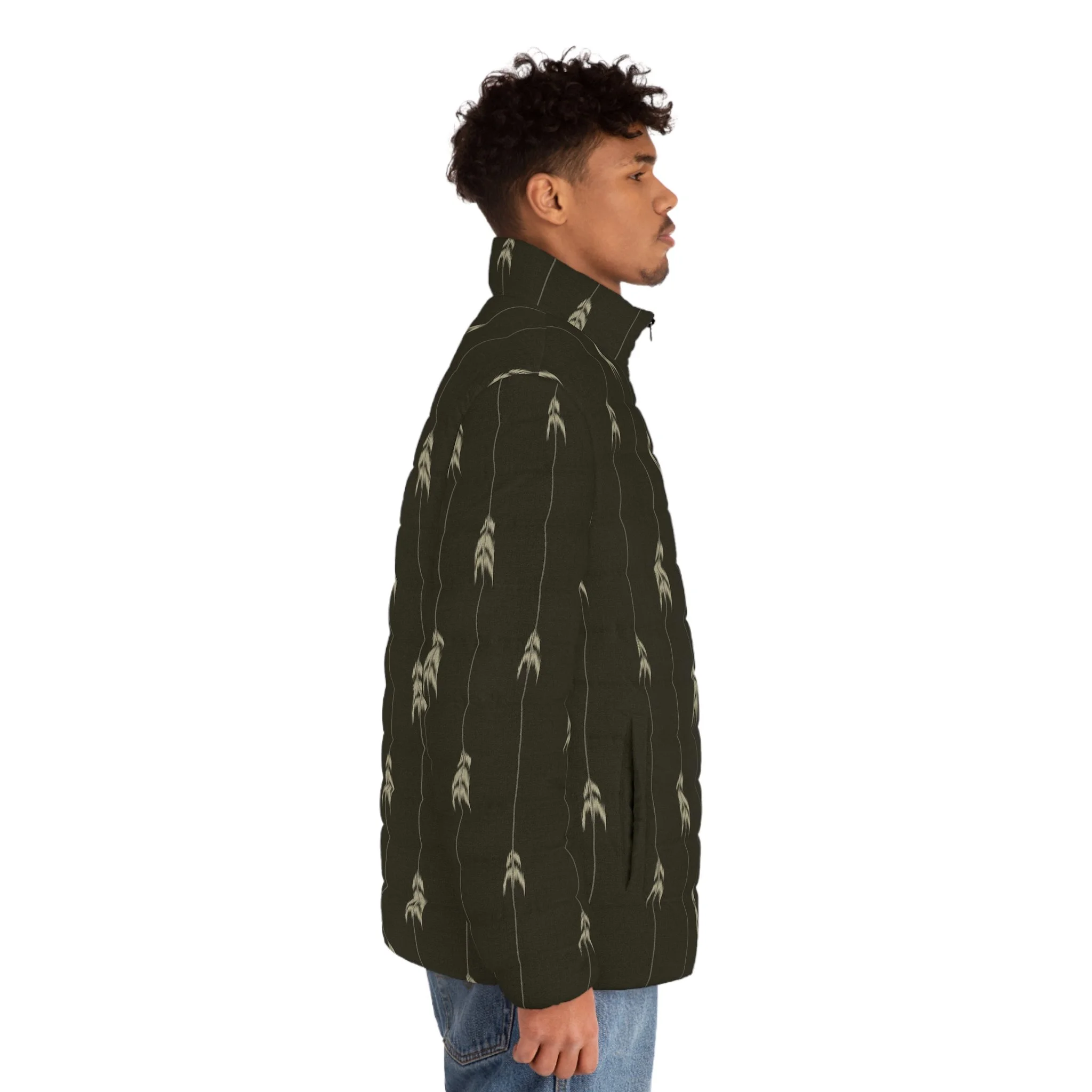 A refined puffer jacket that reads quiet and confident. The pinstripe base gives structure; the pared-back fir tree motif adds a touch of forest calm without shouting. In the inverted green colorway the jacket feels both grounded and modern — imagine stepping out on a crisp morning with the smell of wet needles in the air and your collar turned up against the wind. It slips easily into city commutes and weekend escapes: the regular fit layers over a knit, the stand-up collar keeps drafts out, and the lightweight quilted fill moves with you. Functional details — deep front pockets, elastic cuffs, and a durable zipper with a metal puller — make daily wear effortless. The black cotton-like lining is soft against the skin and helps manage moisture, so the jacket stays comfortable whether you’re running errands or hiking a trail at dusk. Clean, uncomplicated, and quietly stylish, this puffer blends outdoorsy cues with metropolitan polish.