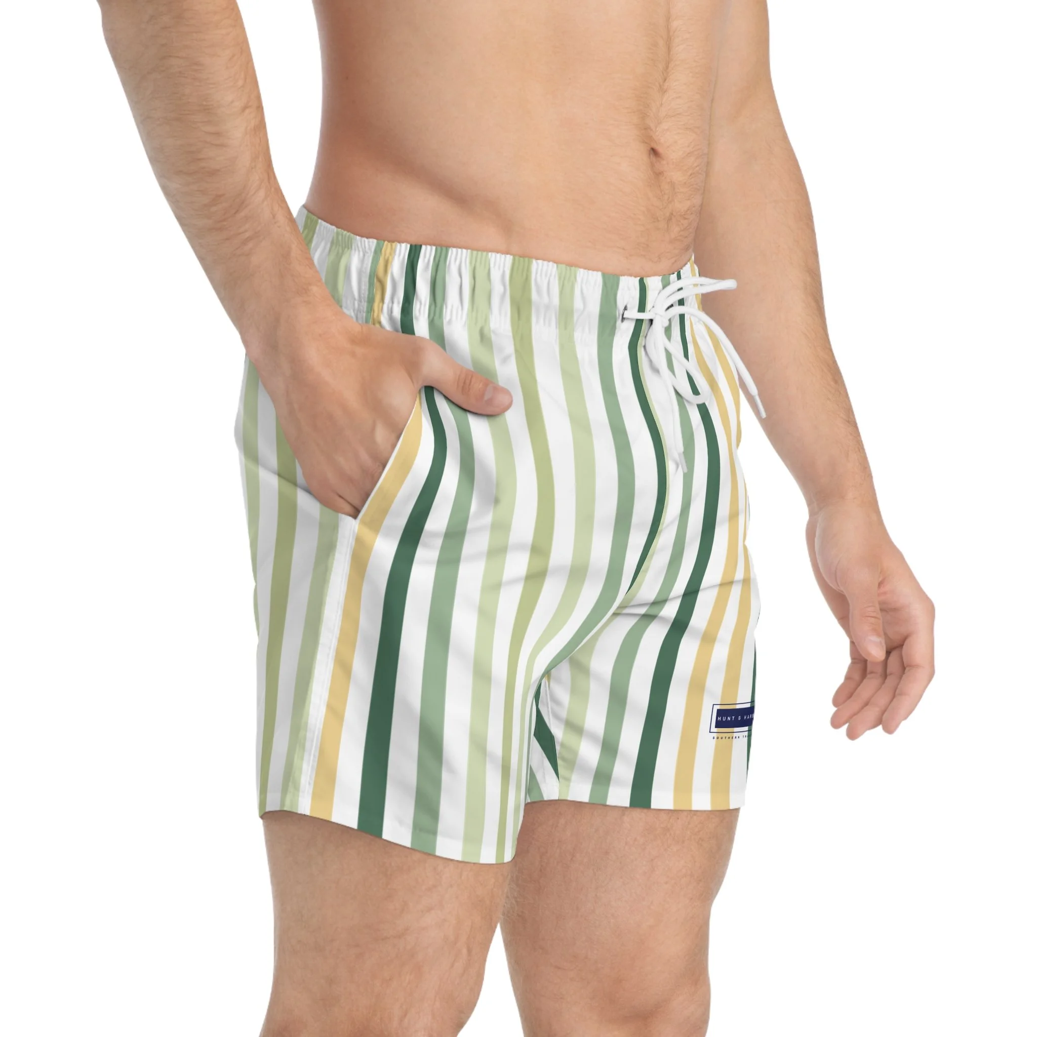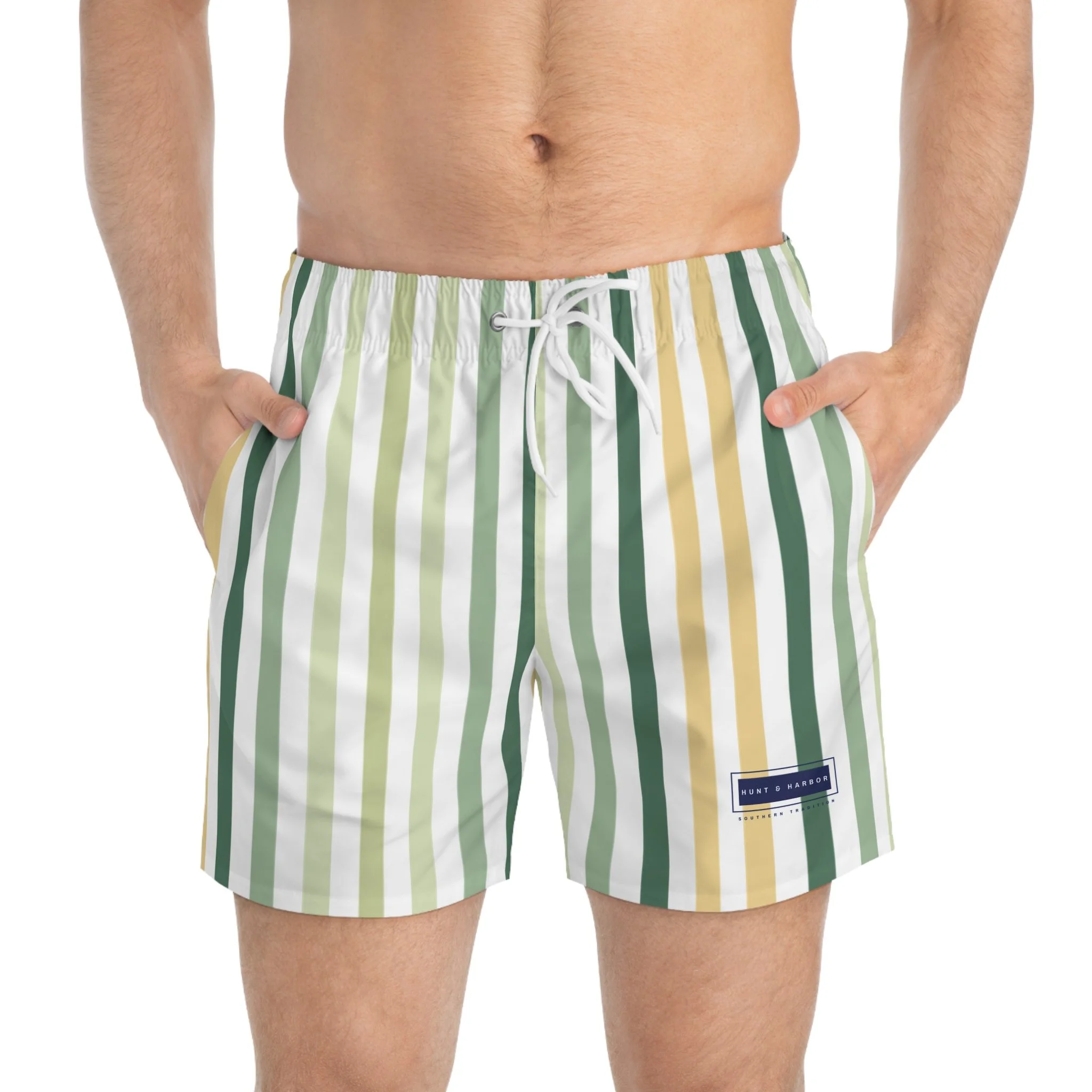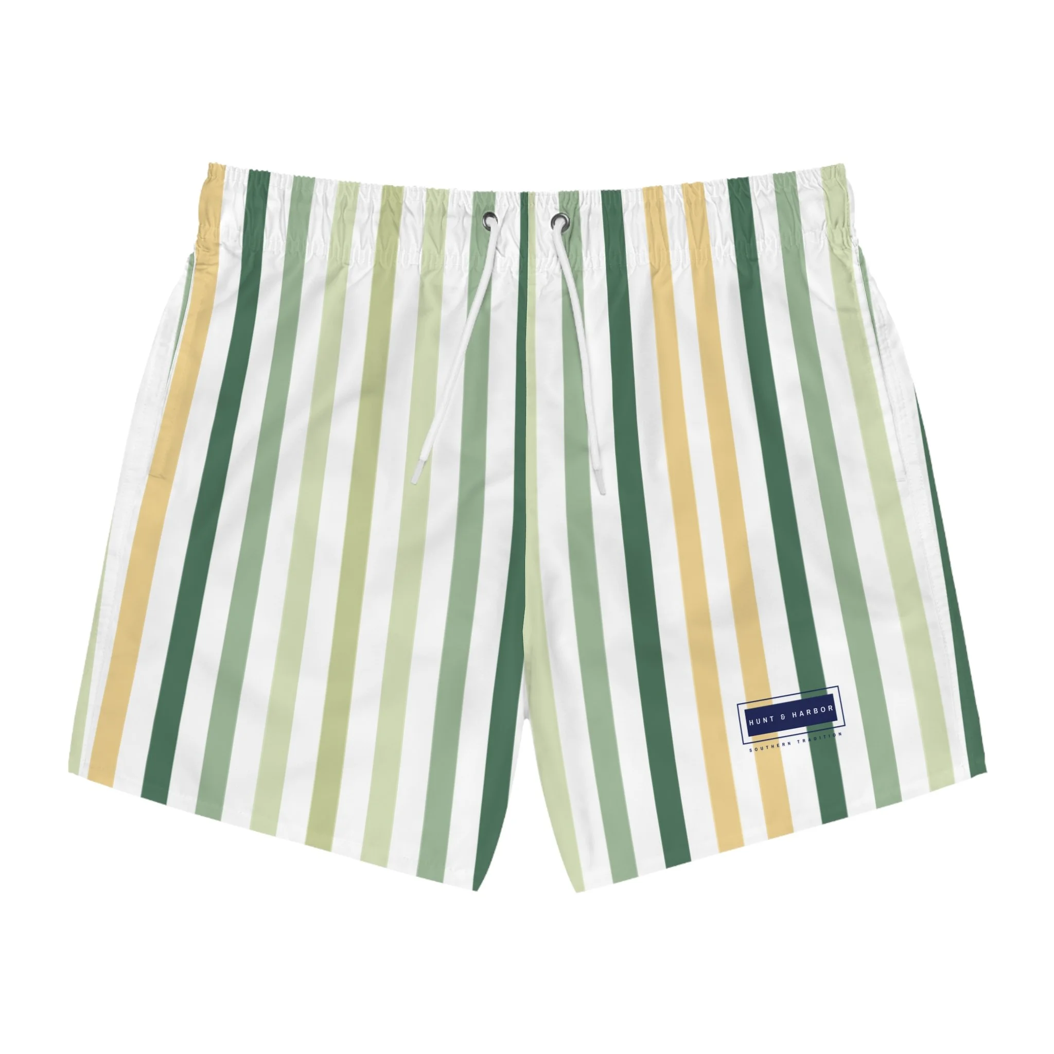 Dive into summer with our vibrant Swim Trunks, perfect for beach days and pool parties. Stay stylish and comfortable at the beach or pool with these swim trunks featuring a cool tone striped pattern and the Hunt & Harbor Southern Tradition logo. Perfect for beach lovers and vacation-goers, these swim trunks give off a relaxed and fun vibe, making them ideal for summer holidays and beach getaways. Ideal for those who love to soak up sun or make a splash at family-friendly gatherings or summer celebrations. Whether you're heading to a tropical vacation or a local beach, these trunks will be your go-to choice for comfort and style. Perfect for men who embrace a laid-back lifestyle, these trunks are a must-have for Father’s Day, beach vacations, or simply lounging by the water.