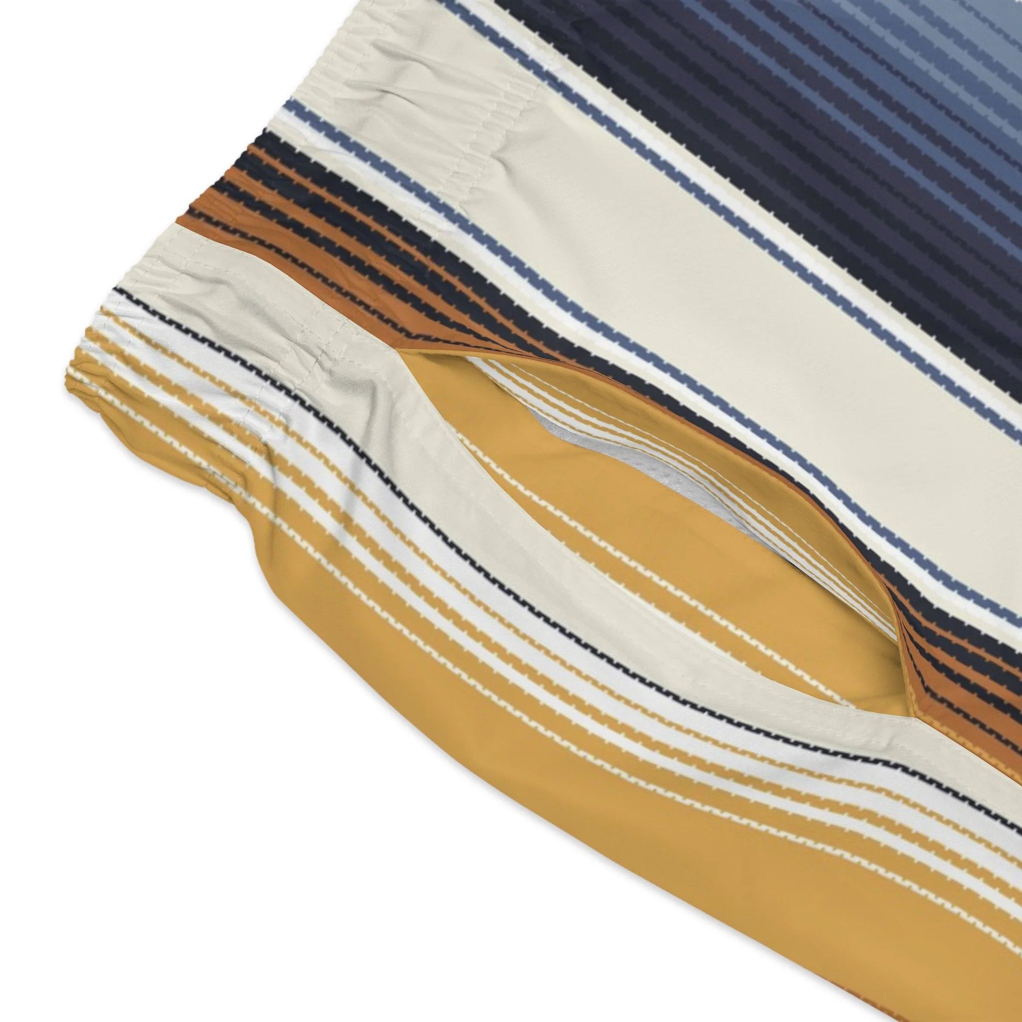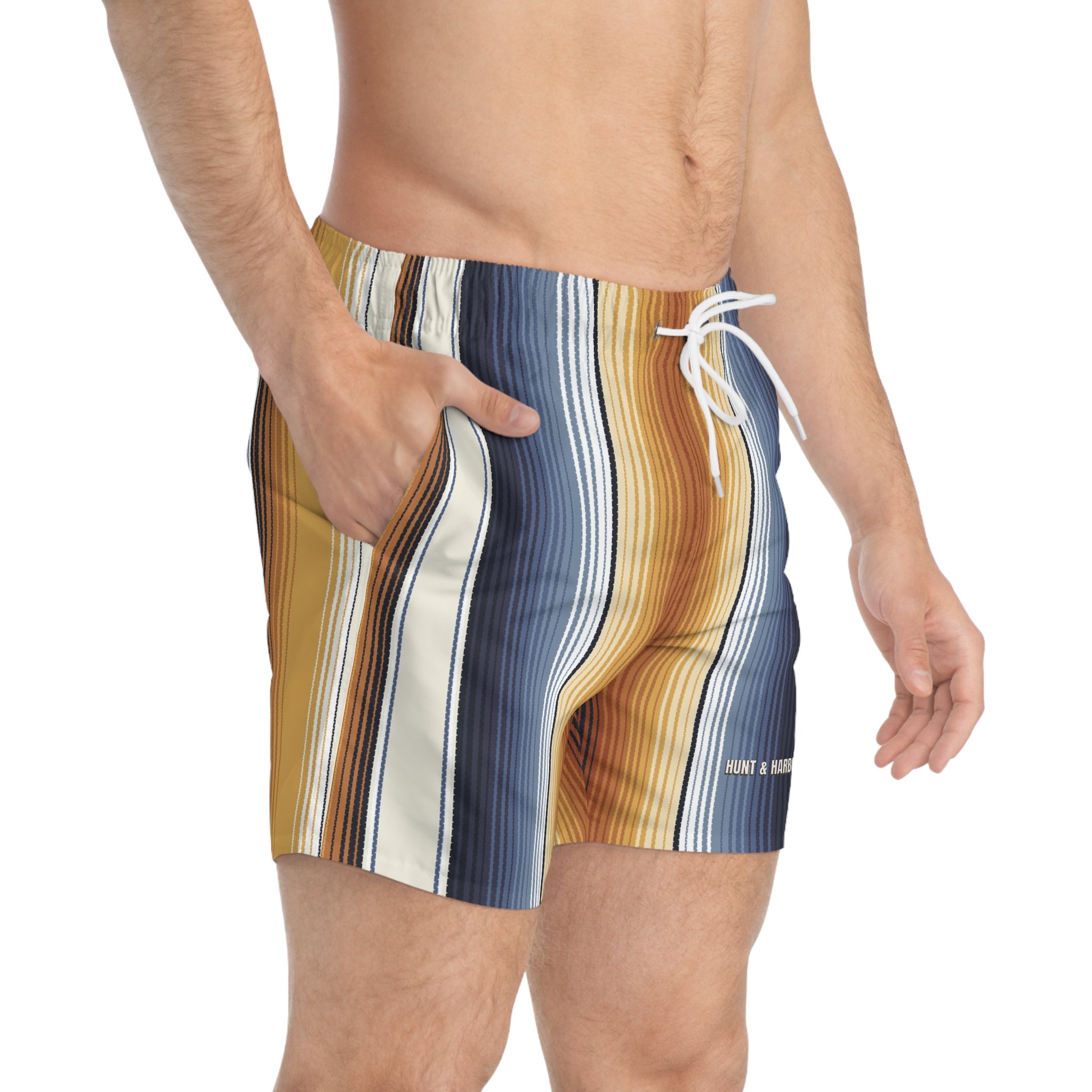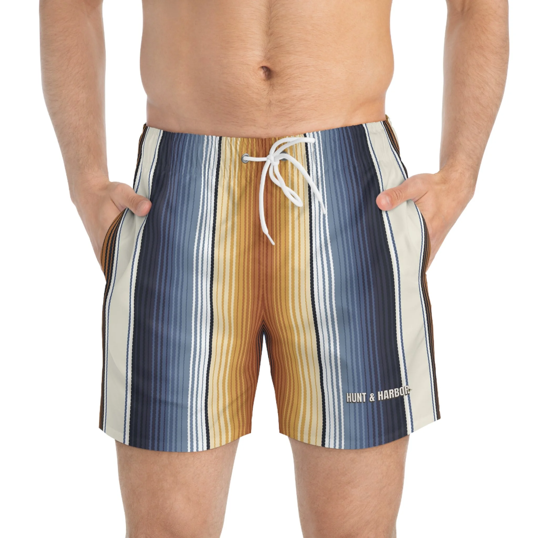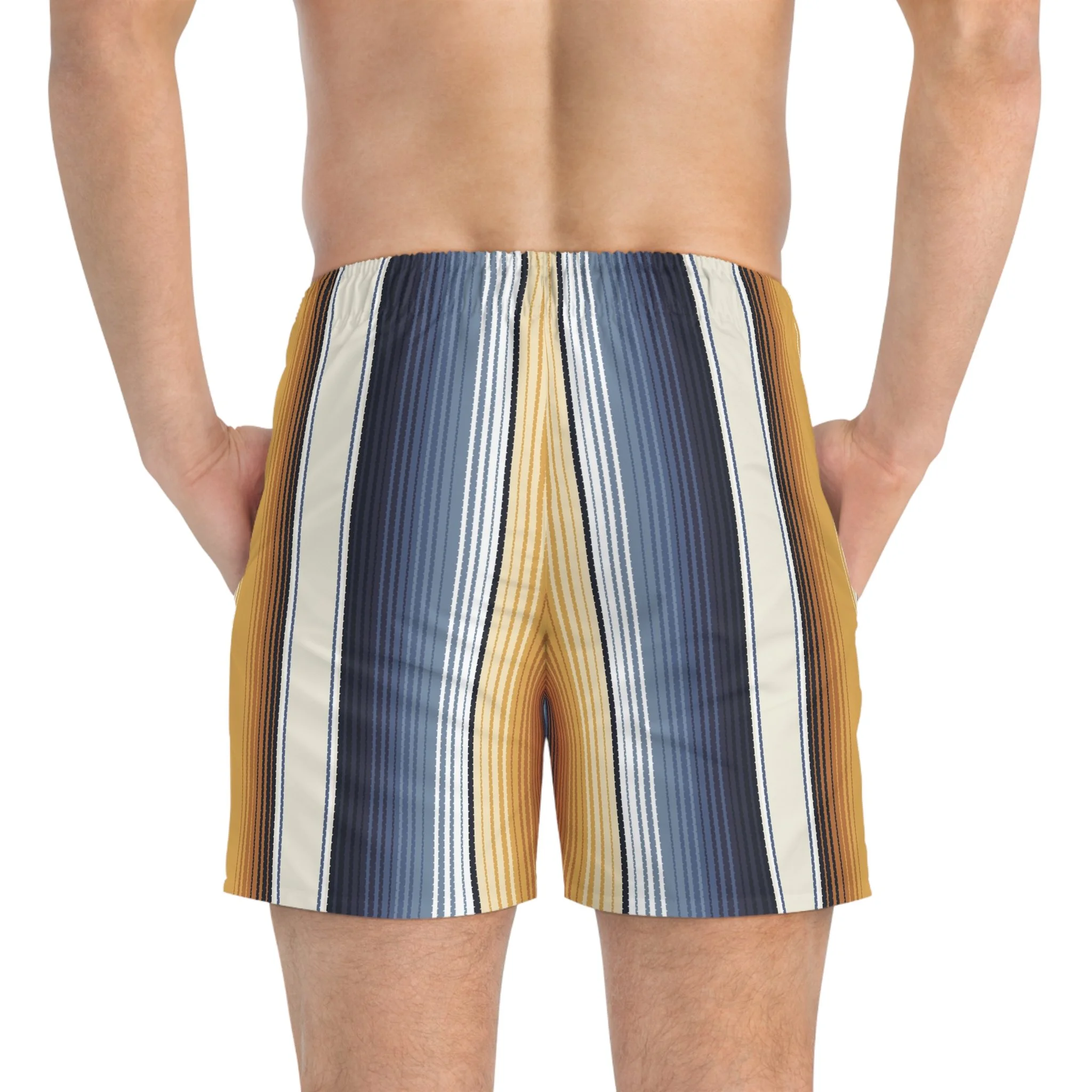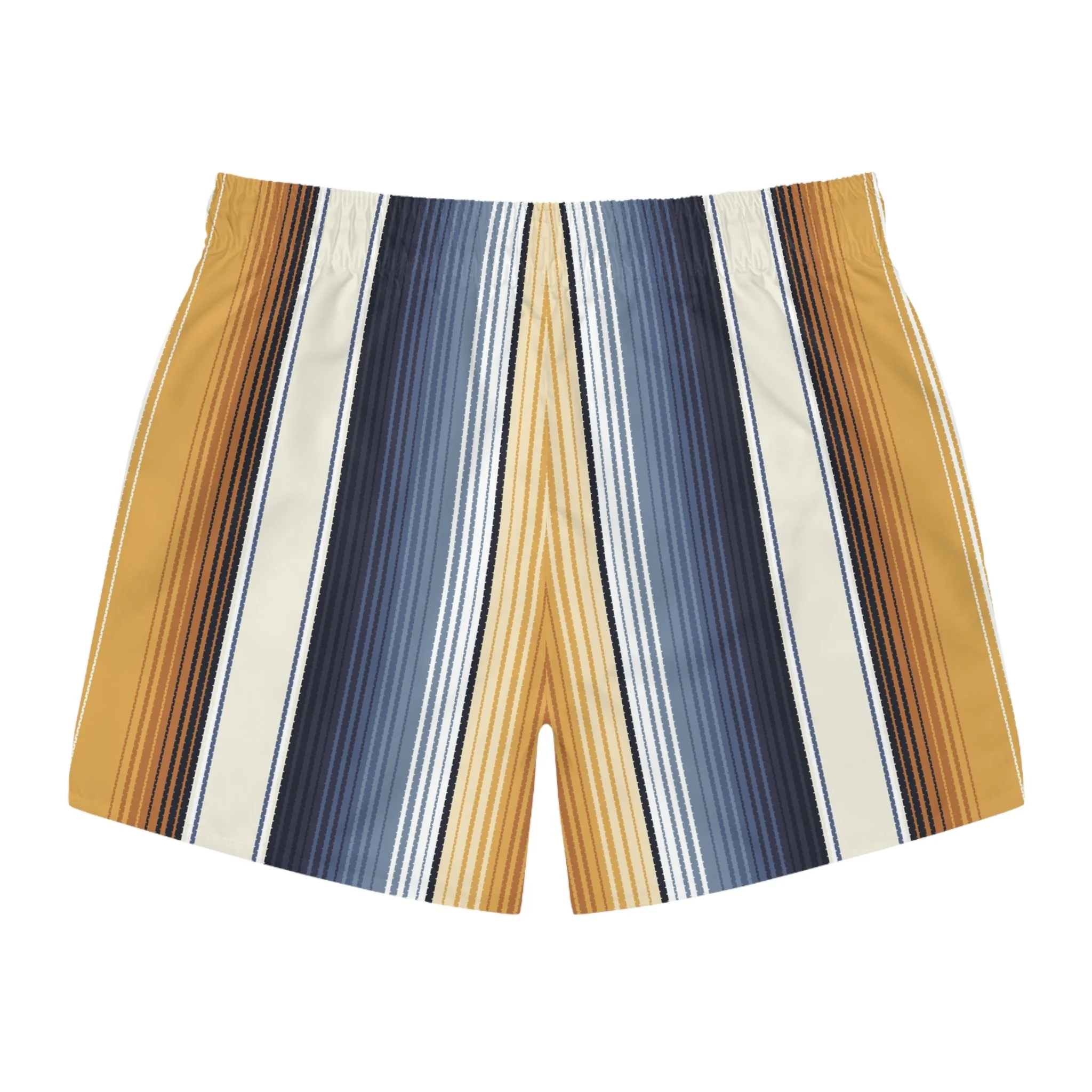These swim trunks bring slow-sunset energy to the shoreline. Vertical stripes in warm amber, deep navy and soft cream create a relaxed, retro mood that moves with you—whether you’re chasing waves at dawn or lingering on a porch as the sky cools. Light, quick-drying fabric and a mesh-lined interior keep things breezy and comfortable. The adjustable drawstring waist lets you lock in a confident fit so you can swim, surf, or wander the boardwalk without fuss.