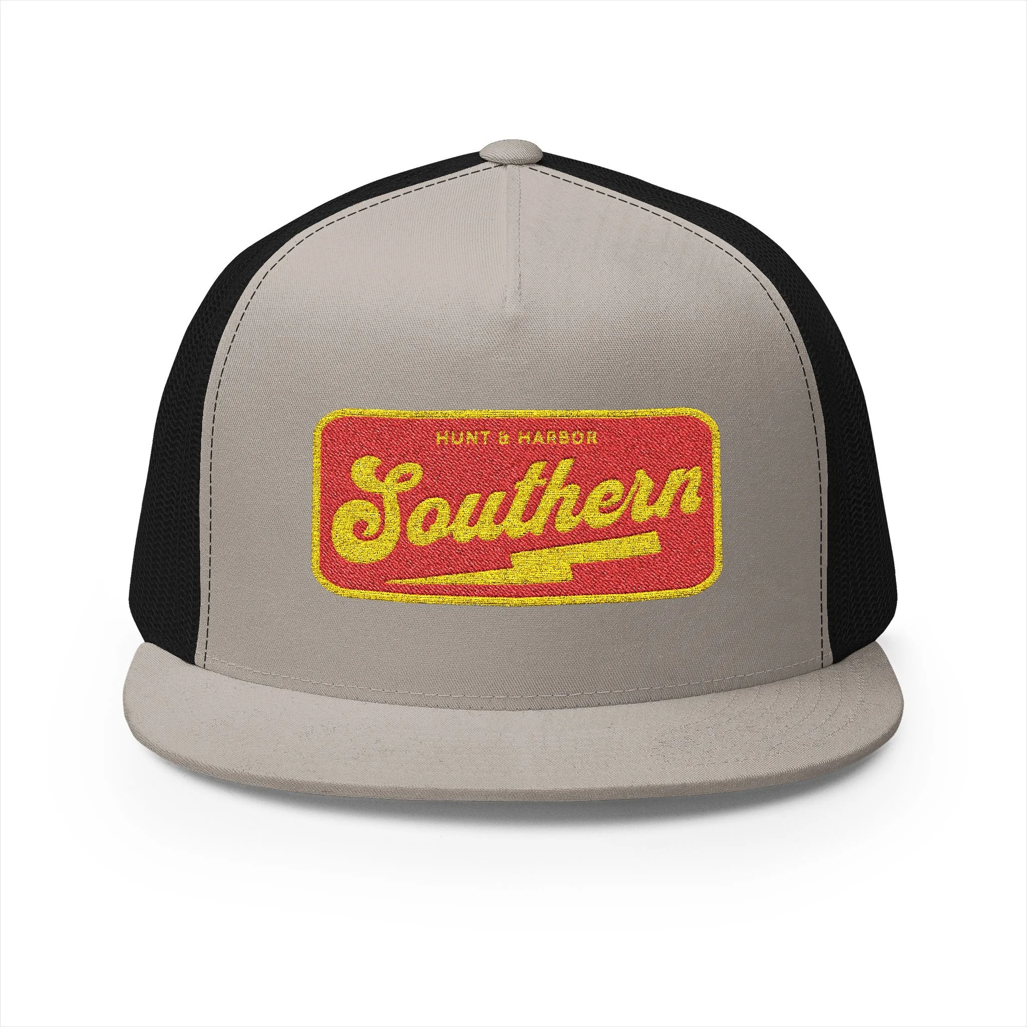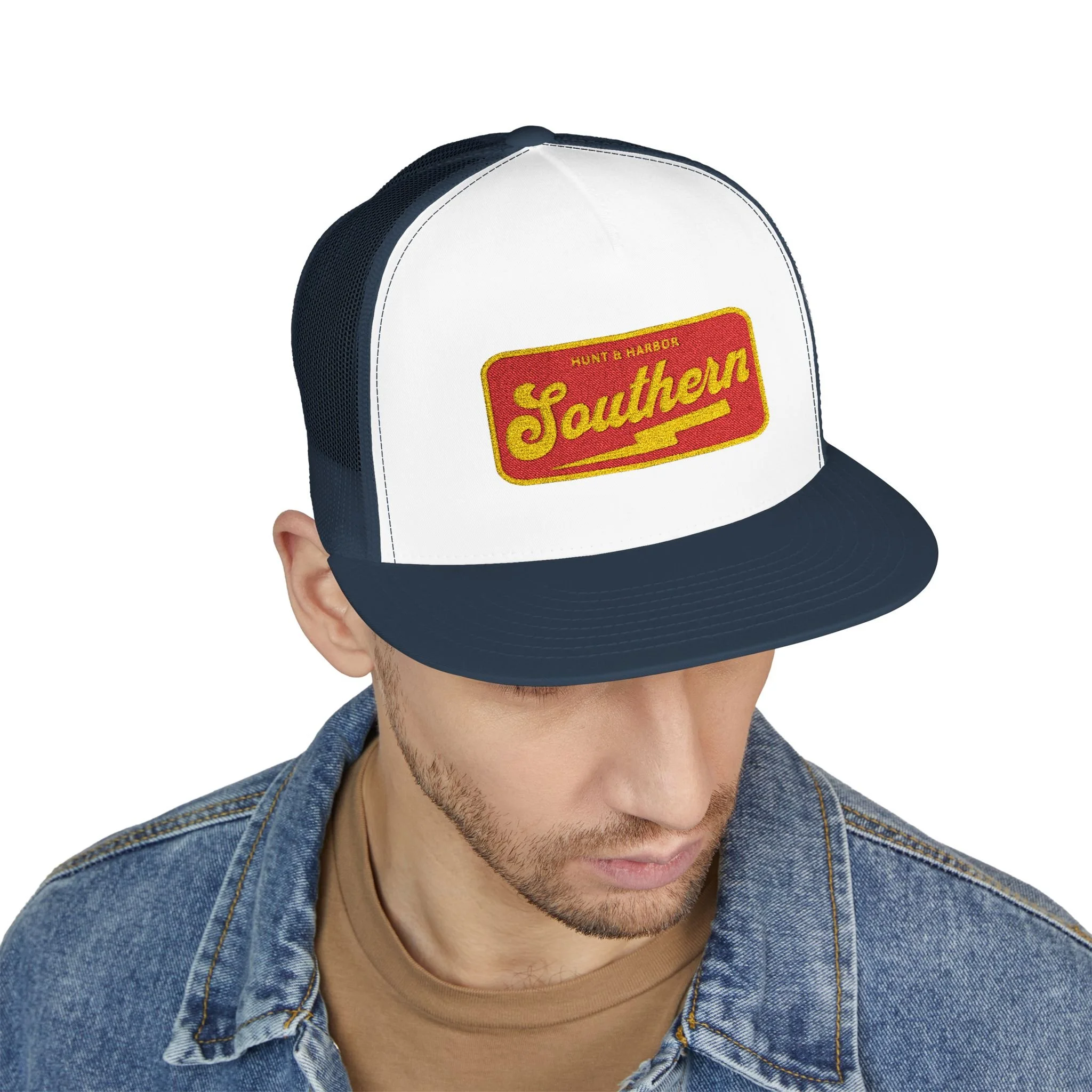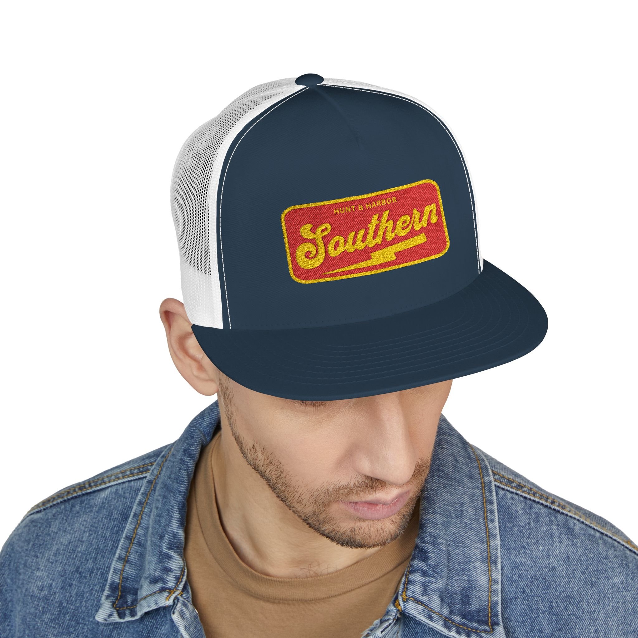 - Flat bill for a classic trucker silhouette