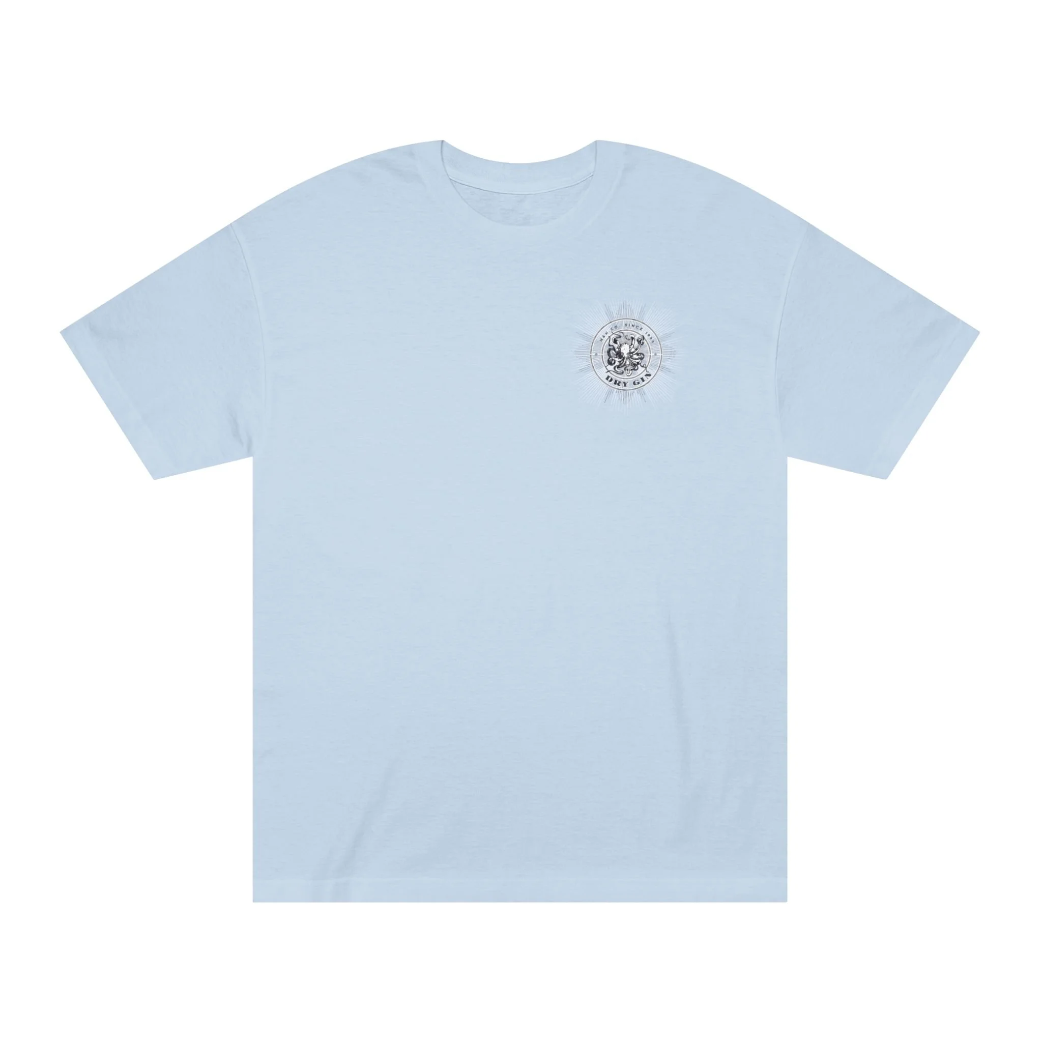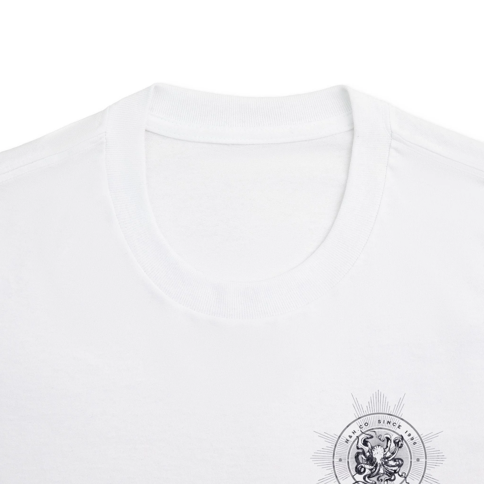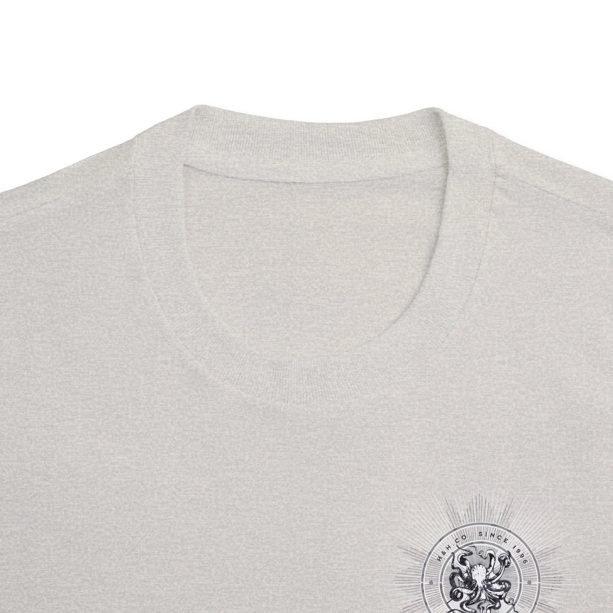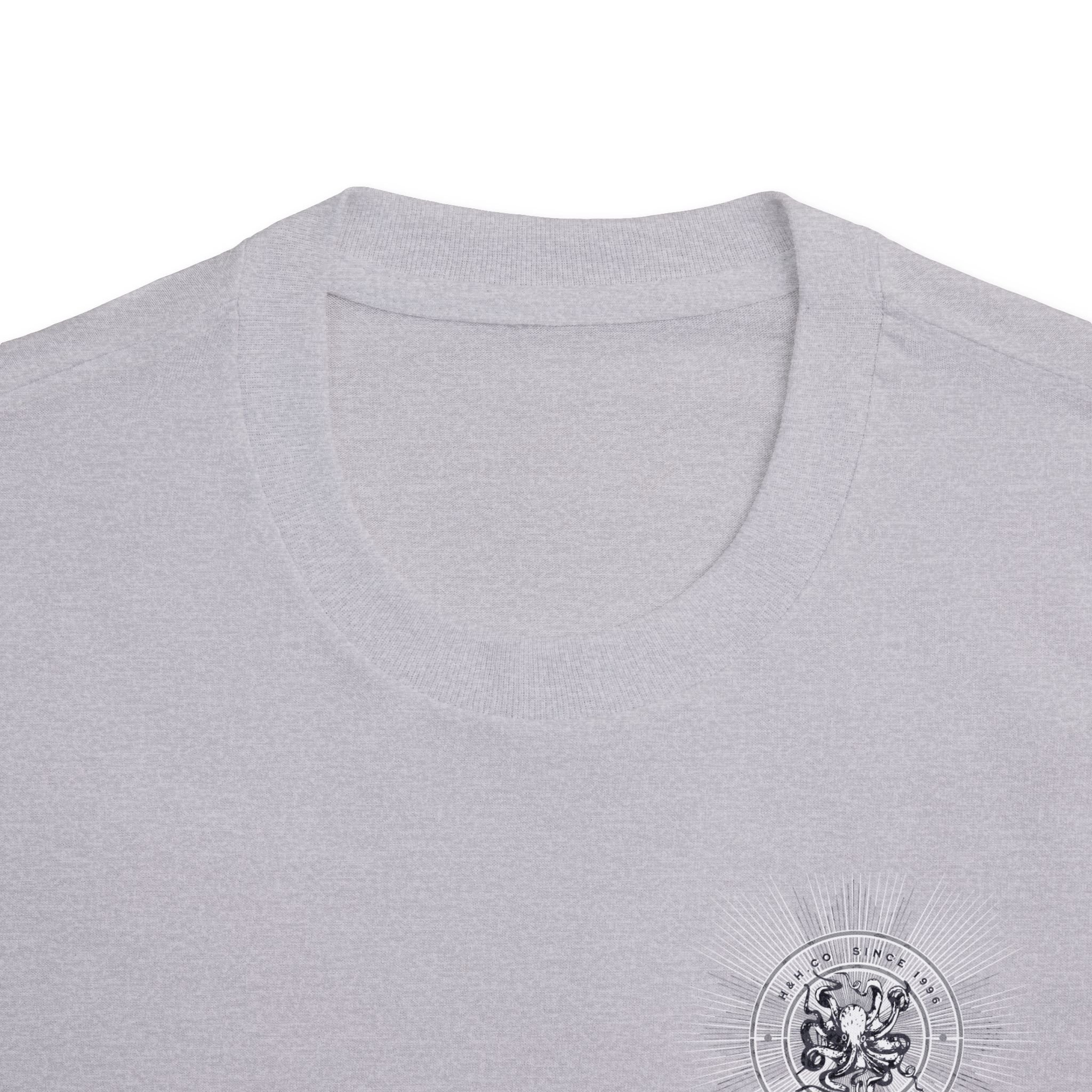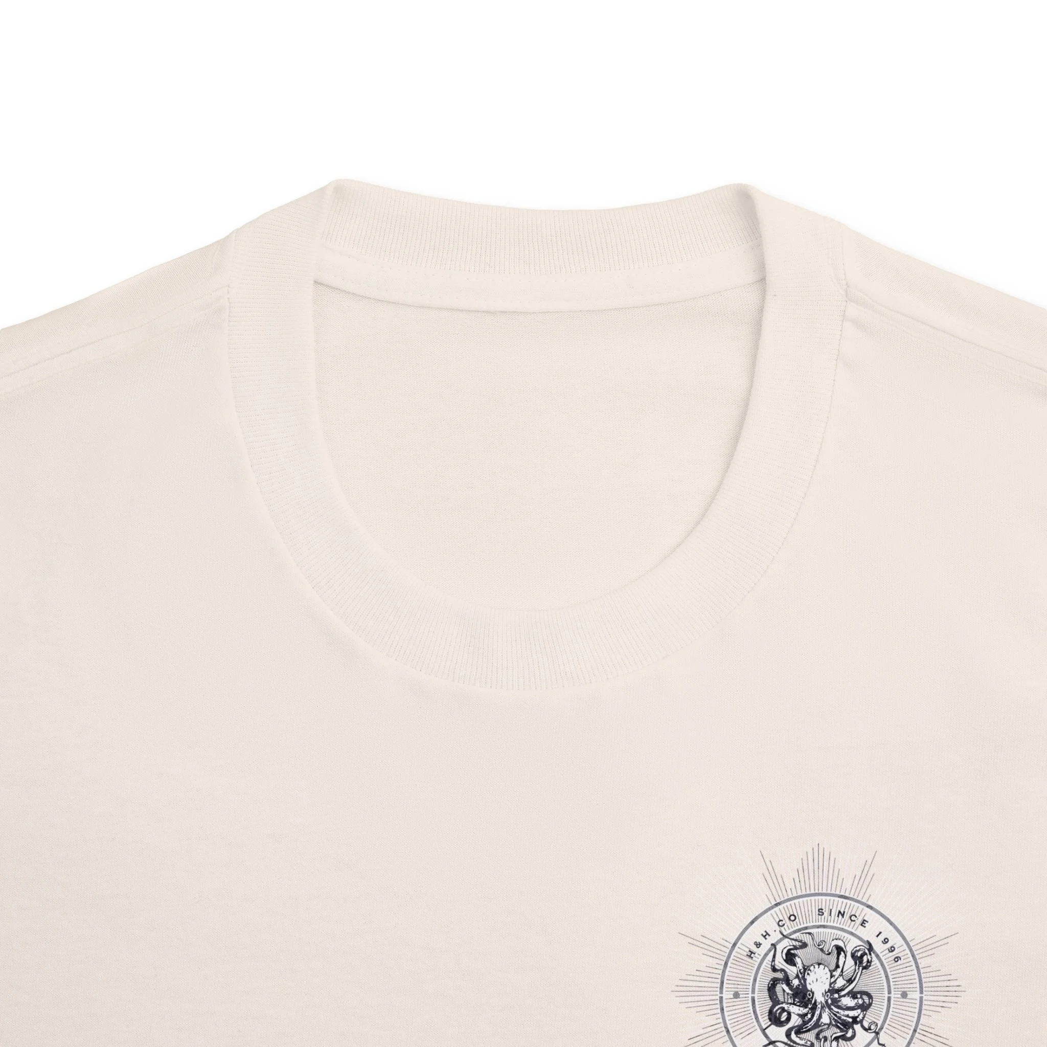 A clean, comfortable tee that feels like a worn-in staple from day one. The front carries a subtle chest emblem while the back unfolds a vintage-inspired label Squid Ink Infused Gin design — think maritime logs and coastal tradesmen’s stamps. Lightweight but substantial, it sits loose in a classic fit so you can layer it under a chore jacket or wear it solo on slow weekends along the pier. It accompanies mornings that begin with black coffee and the sound of gulls, and evenings spent comparing maps and tide tables with friends. Wear it when you want something low-key that still tells a story.